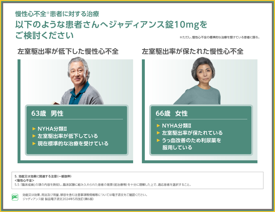 左室駆出率を問わず、慢性心不全※の標準的な治療を受けている患者さんにジャディアンス錠10mgの処方をご検討ください。