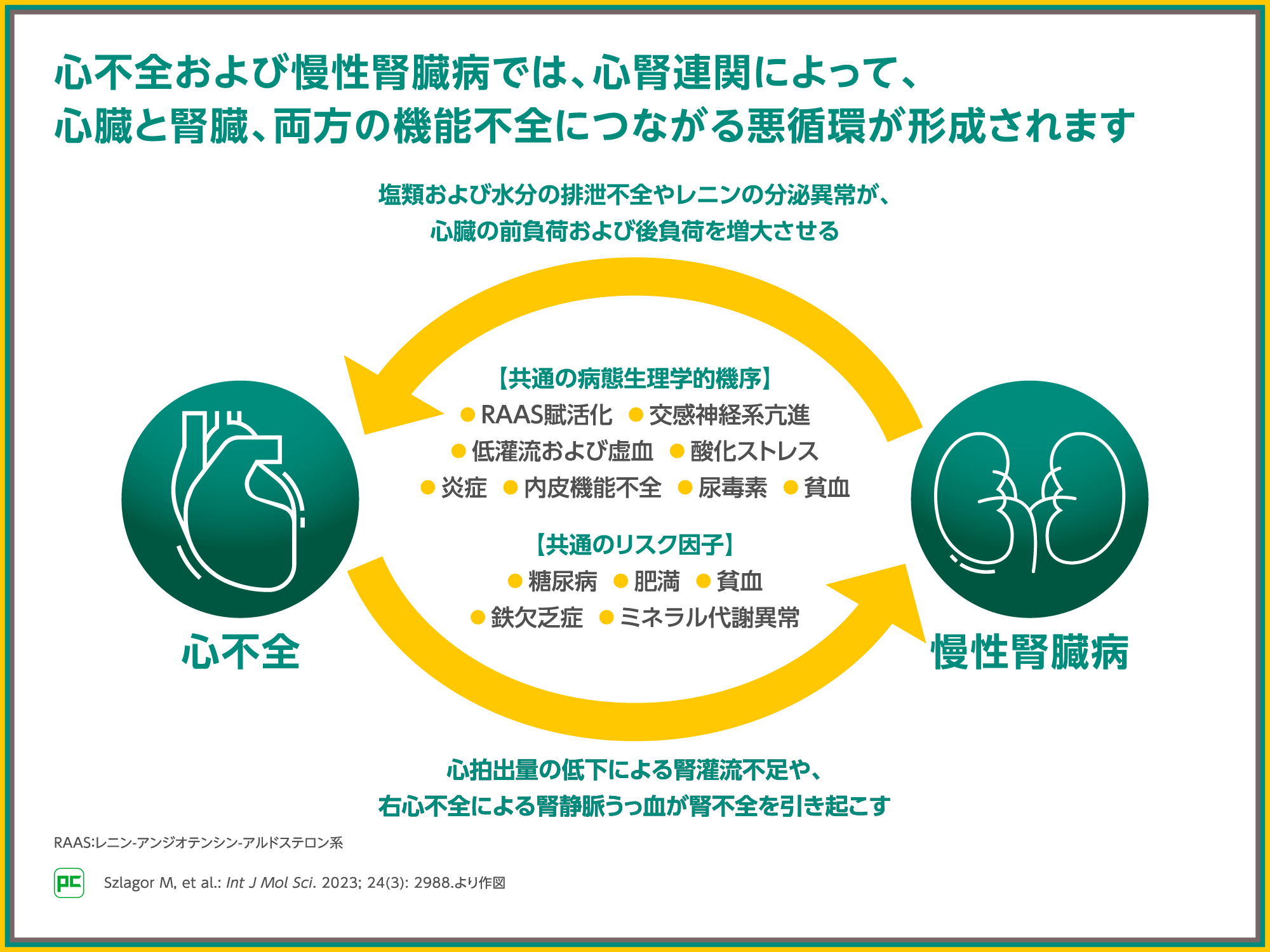 同様に、腎機能障害による病態生理学的な変化が心血管疾患の悪化を惹起することから、心臓と腎臓の相互の機能不全につながる悪循環は心腎連関として知られています。