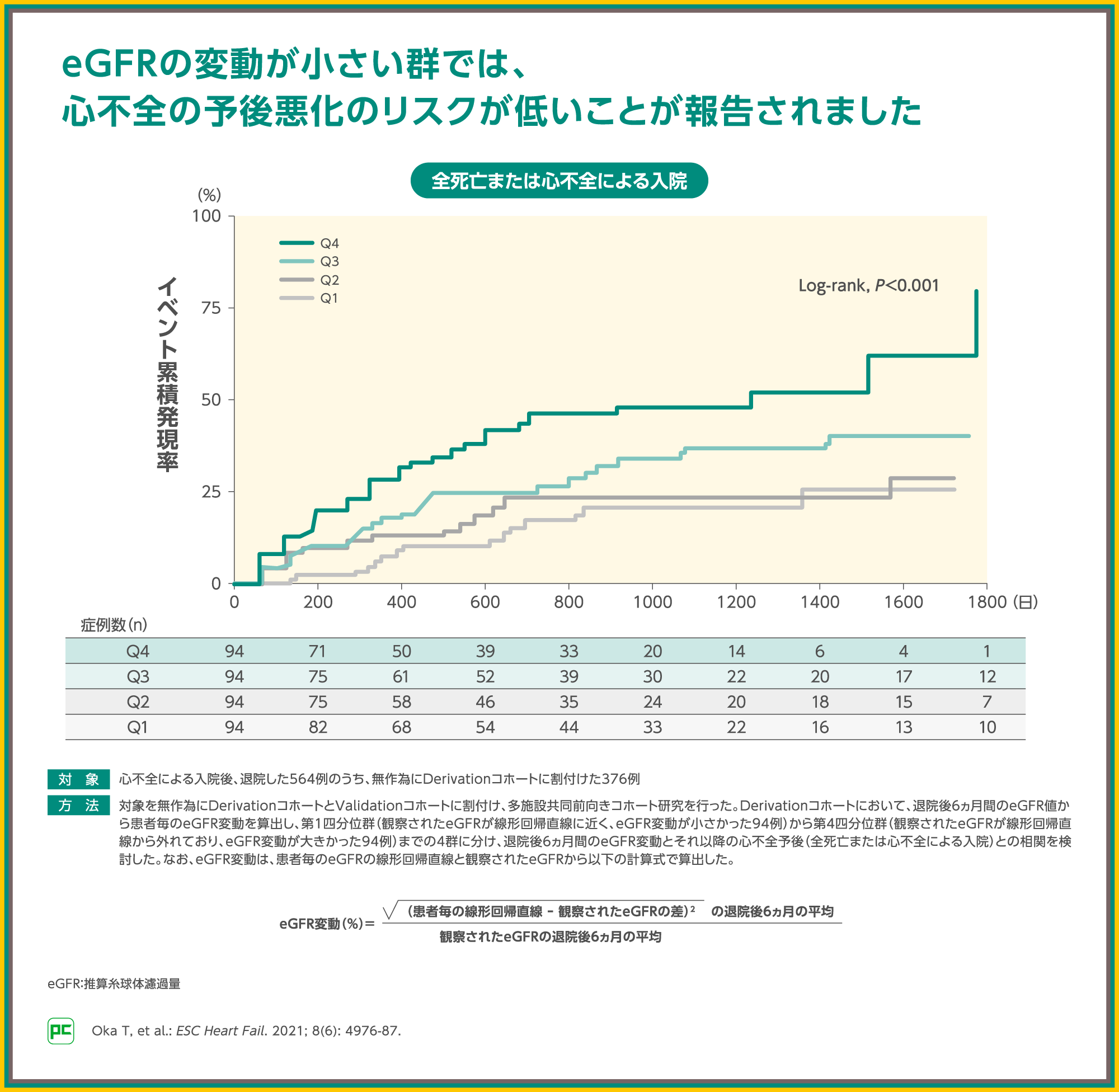 心不全による入院をした患者を対象として、退院後6ヵ月間のeGFR変動別に、全死亡または心不全による入院の累積発現率を検討した結果、eGFRの変動が小さいほど、心不全の予後悪化のリスクが低かったと報告されており(p<0.001、Log-rank test)、心不全治療では、腎機能への影響を考慮した治療選択が望ましいことが示されました。