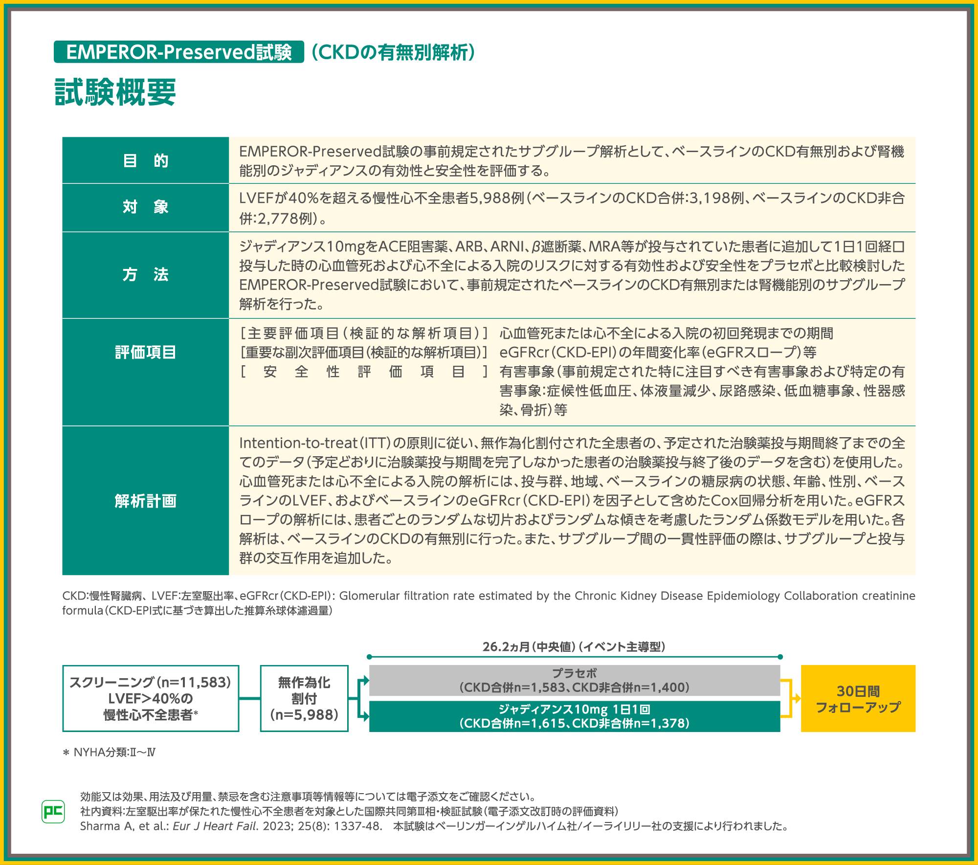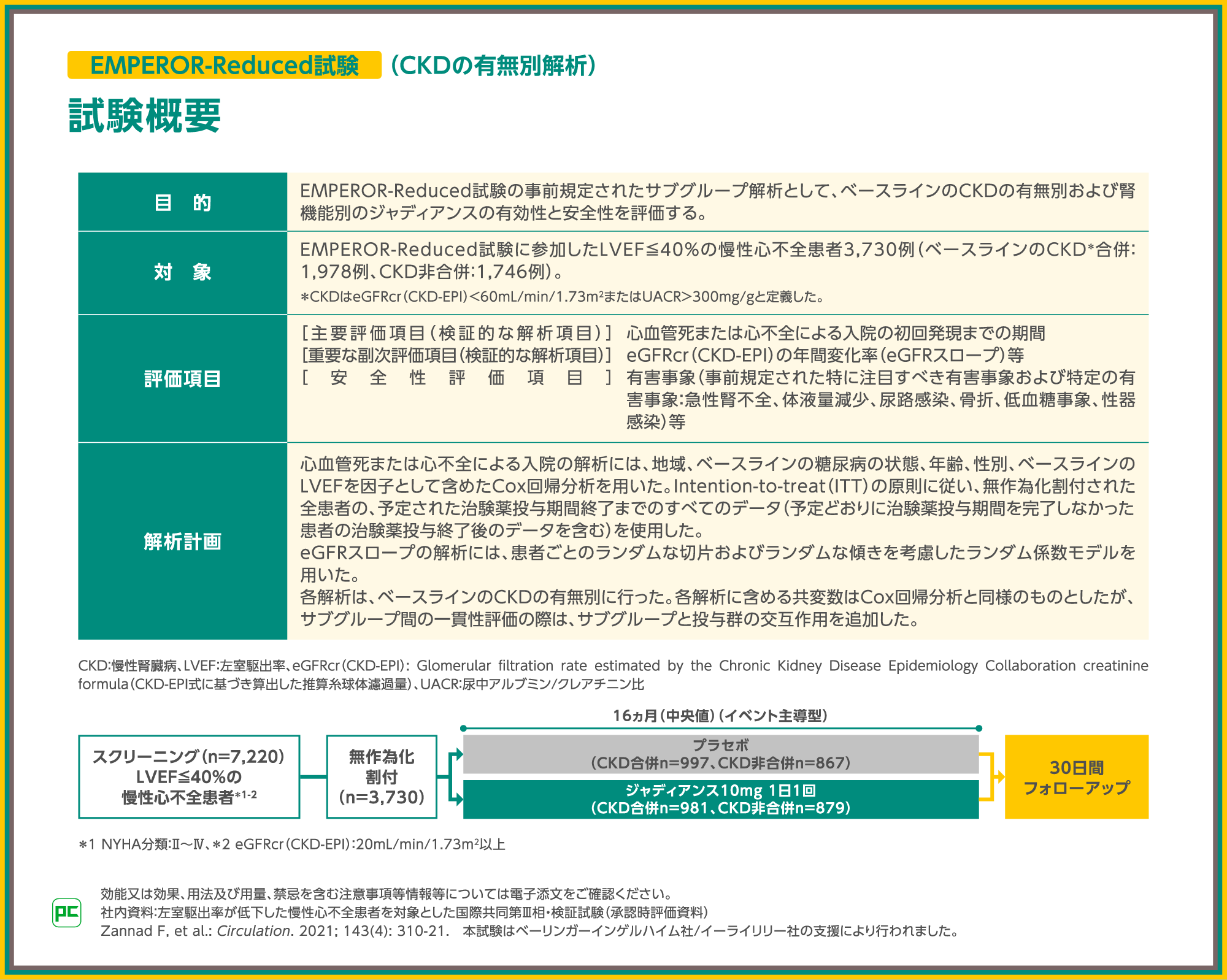 SGLT2阻害薬であるジャディアンスでは、慢性心不全に対する有効性を検証したEMPEROR-Reduced試験、EMPEROR-Preserved試験の両方で、CKDの有無別解析を行いました。