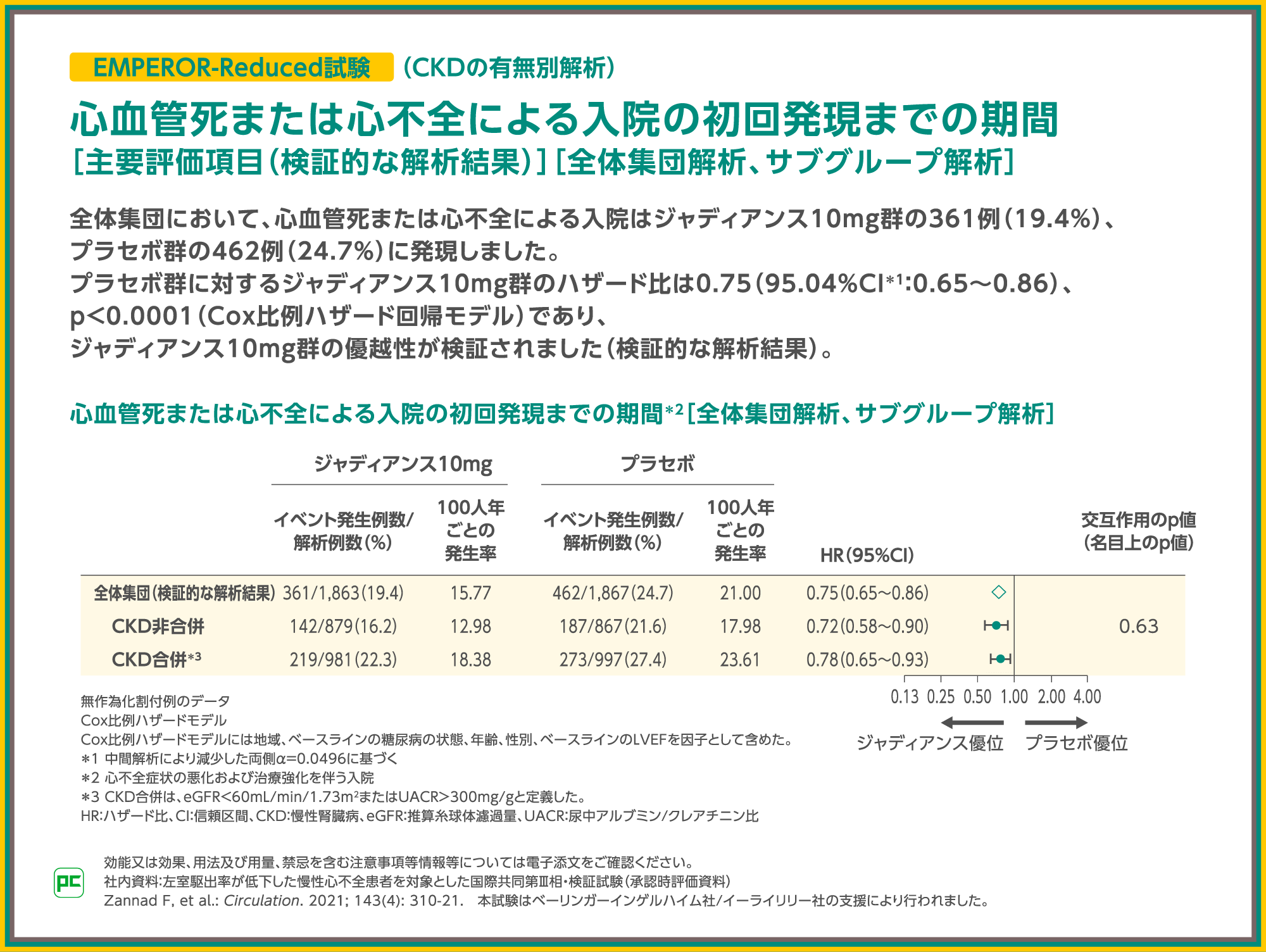 また、CKD合併でのプラセボ群に対するジャディアンス10mg群のハザード比は0.78(95%CI:0.65~0.93)、CKD非合併でのプラセボ群に対するジャディアンス10mg群のハザード比は0.72(95%CI:0.58~0.90)(交互作用のp値:0.63、名目上のp値)でした。