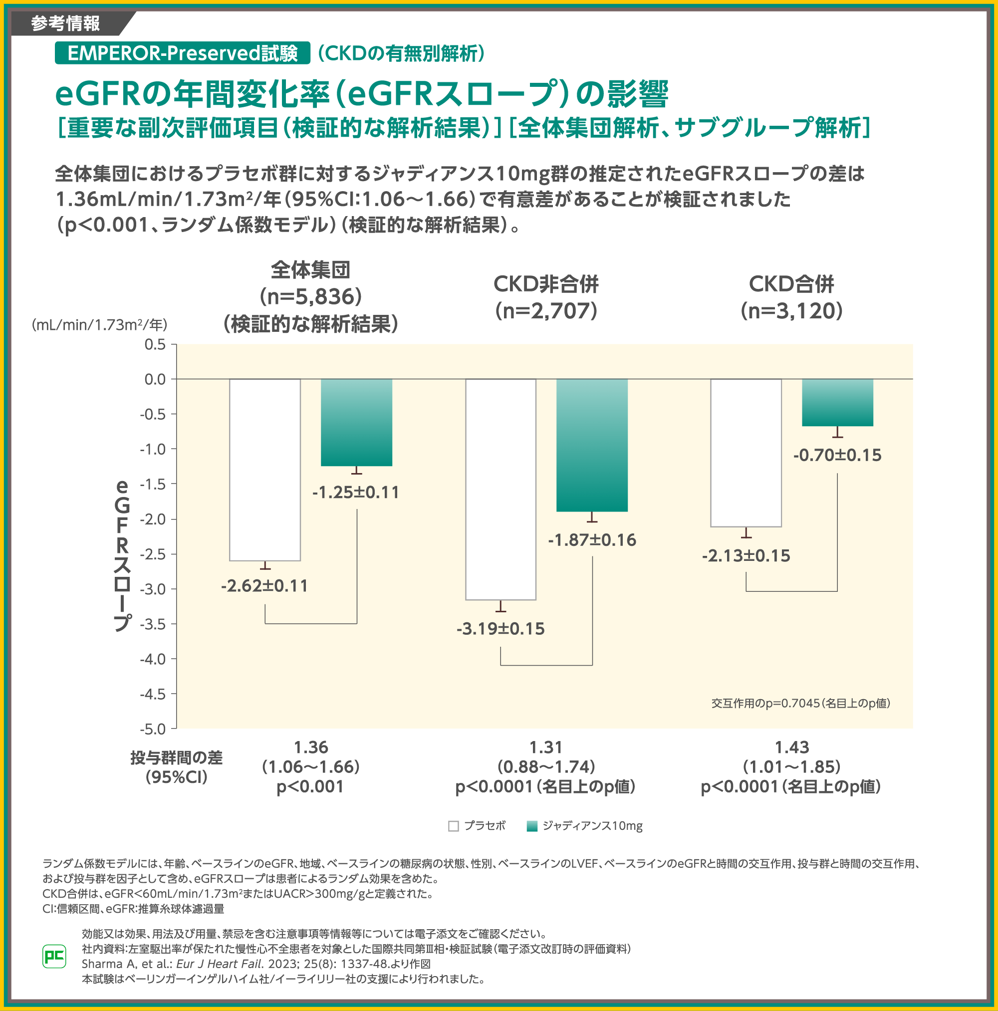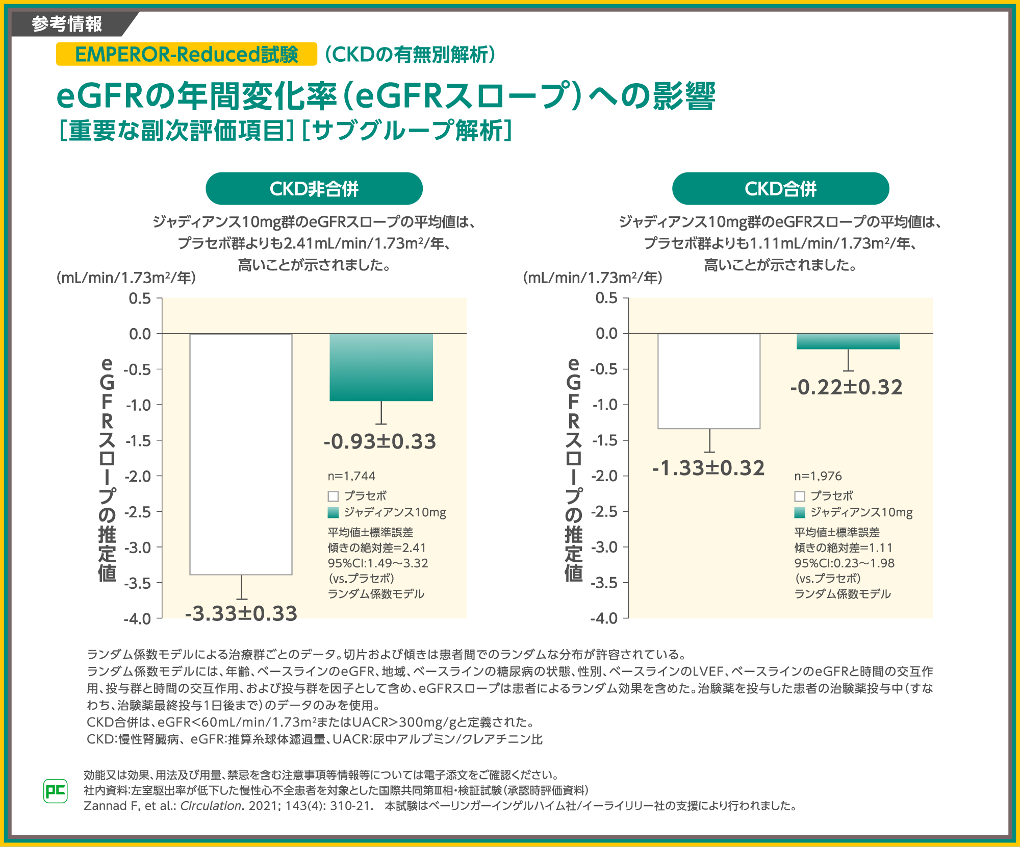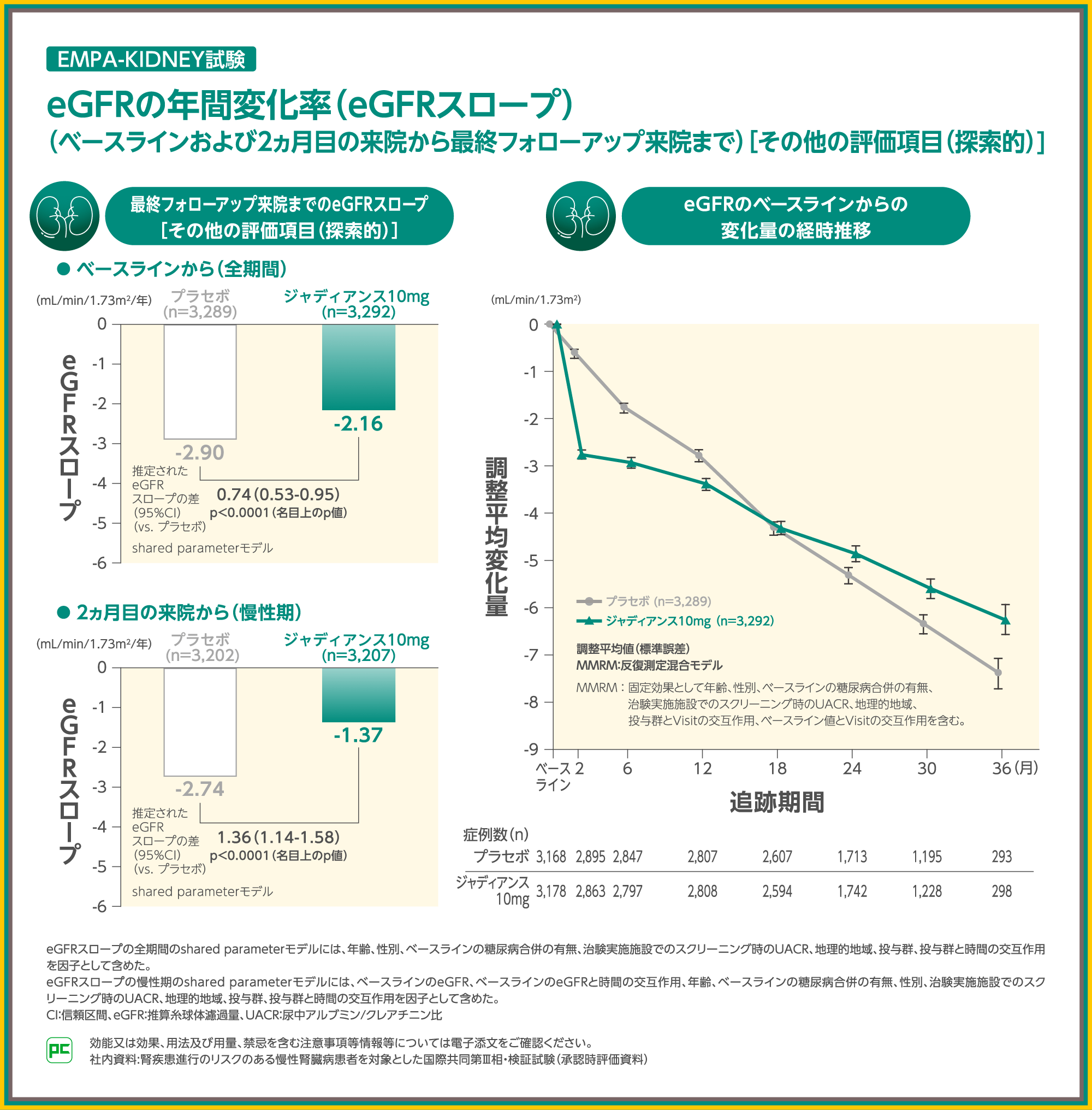 腎機能への影響を示すeGFRスロープ (mL/min/1.73m2/年)は、CKD合併のジャディアンス10mg群で-0.70±0.15、プラセボ群で-2.13±0.15、CKD非合併のジャディアンス10mg群で-1.87±0.16、プラセボ群で-3.19±0.15でした。