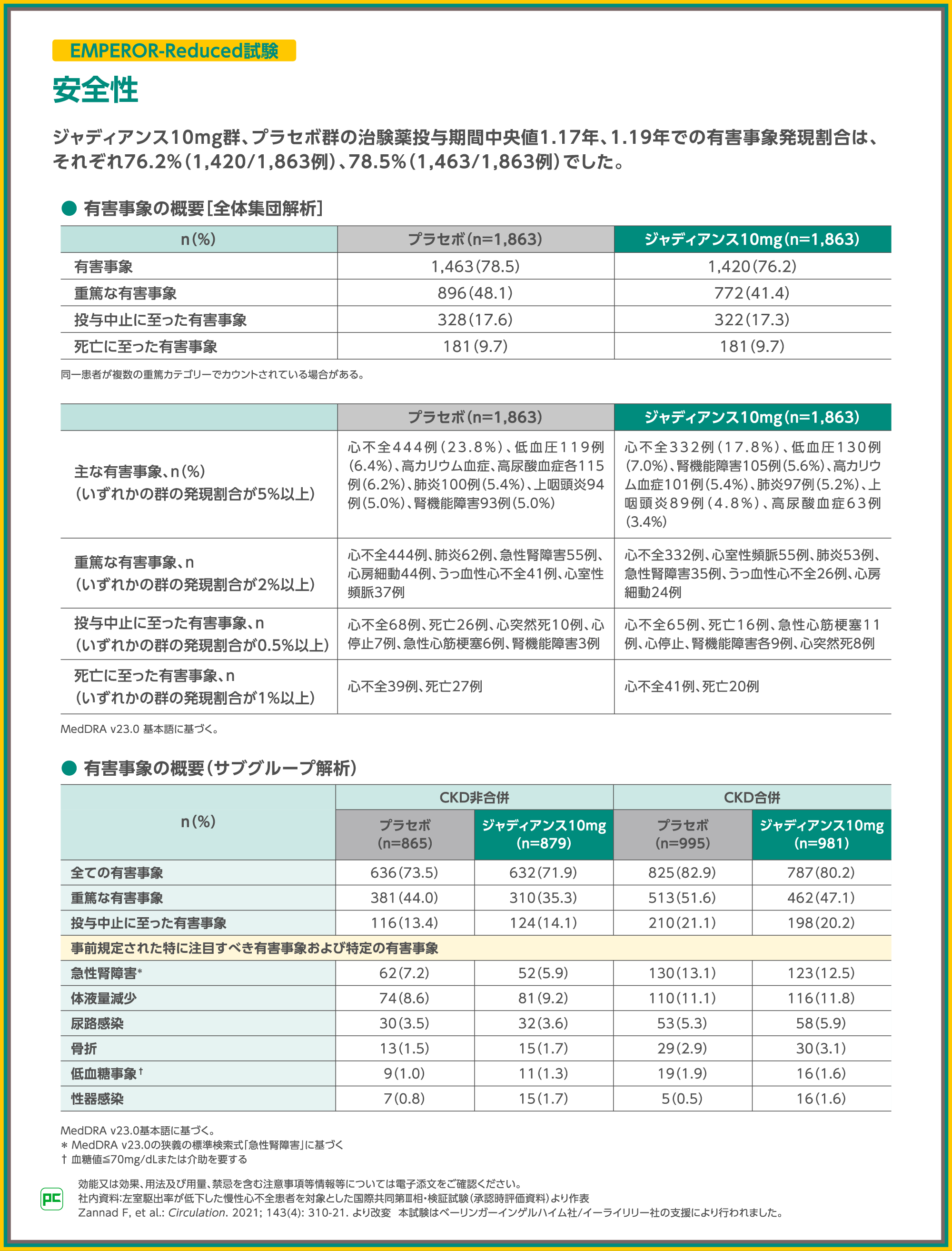 EMPEROR-Reduced試験の全体集団での有害事象の発現割合は、ジャディアンス10mg群で76.2%(1,420/1,863例)、プラセボ群で78.5%(1,463/1,863例)でした。
