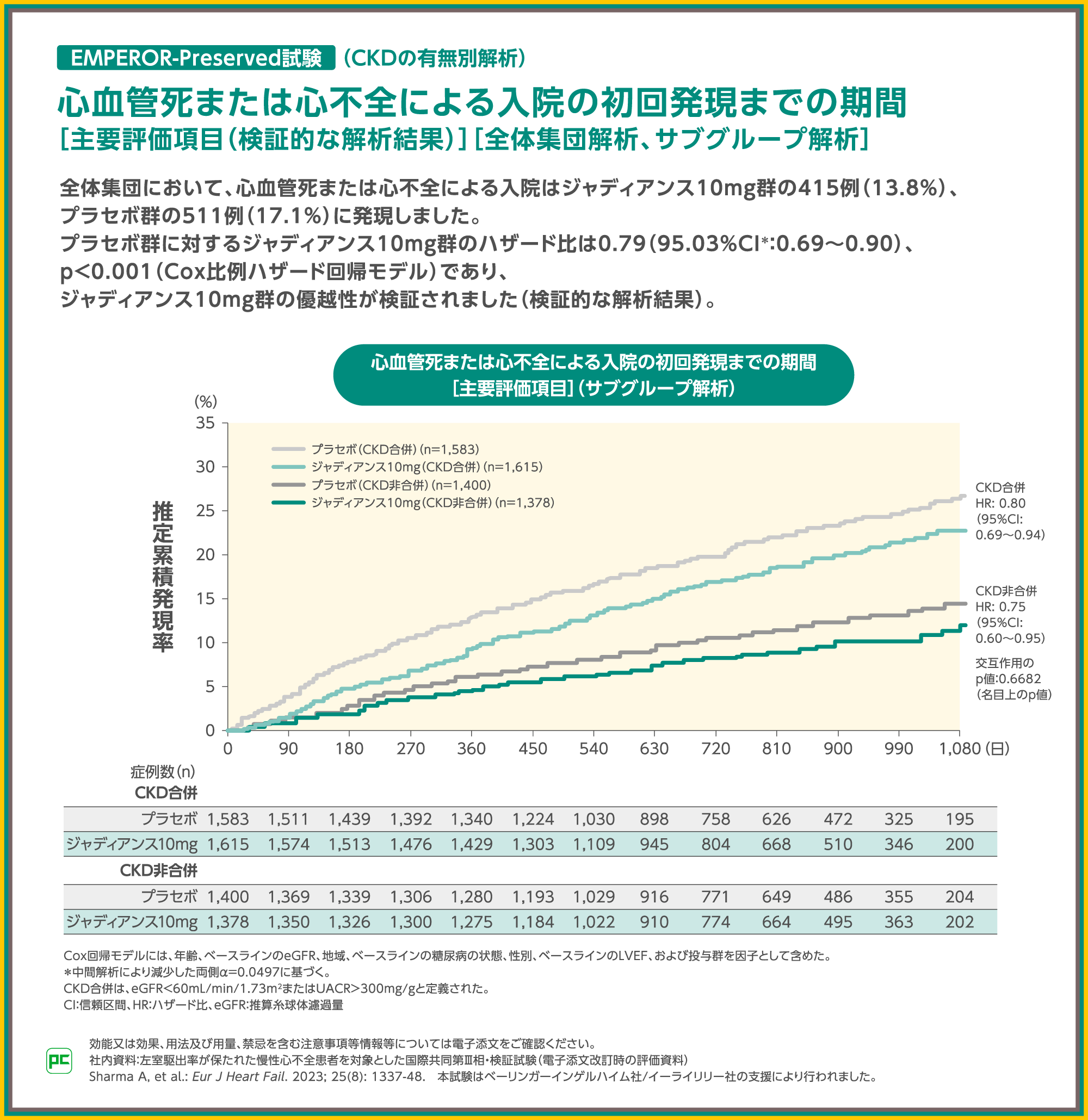 HFpEFを対象としたEMPEROR-Preserved試験でも、ジャディアンス10mgを1日1回経口投与した時の有効性および安全性のプラセボ群と比較検討を、全体集団解析に加え、CKD合併とCKD非合併に分けた事前規定されたサブグループ解析で行いました。