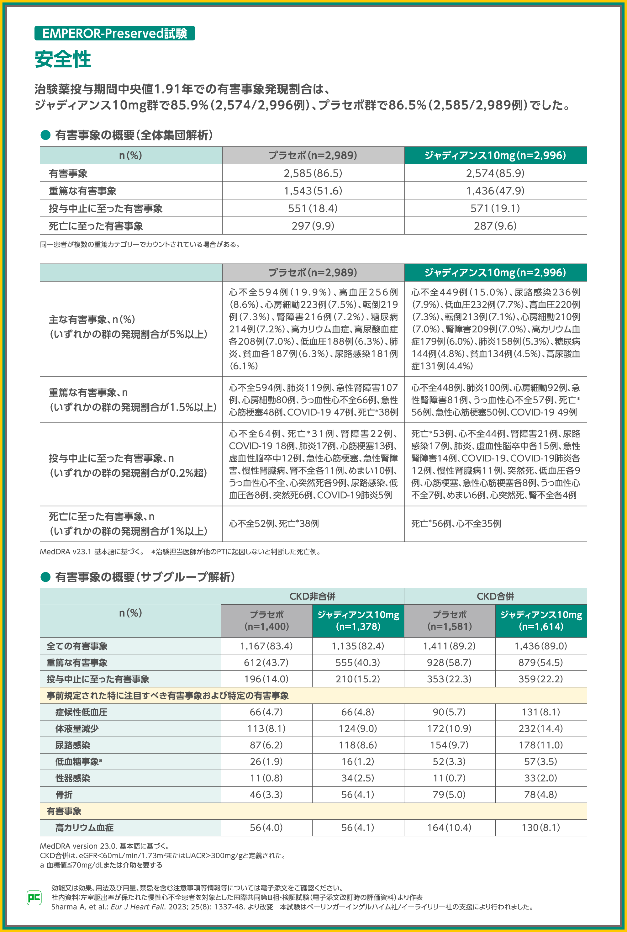 EMPEROR-Preserved試験の全体集団での有害事象の発現割合は、ジャディアンス10mg群で85.9%(2,574/2,996例)、プラセボ群で86.5%(2,585/2,989例)でした。