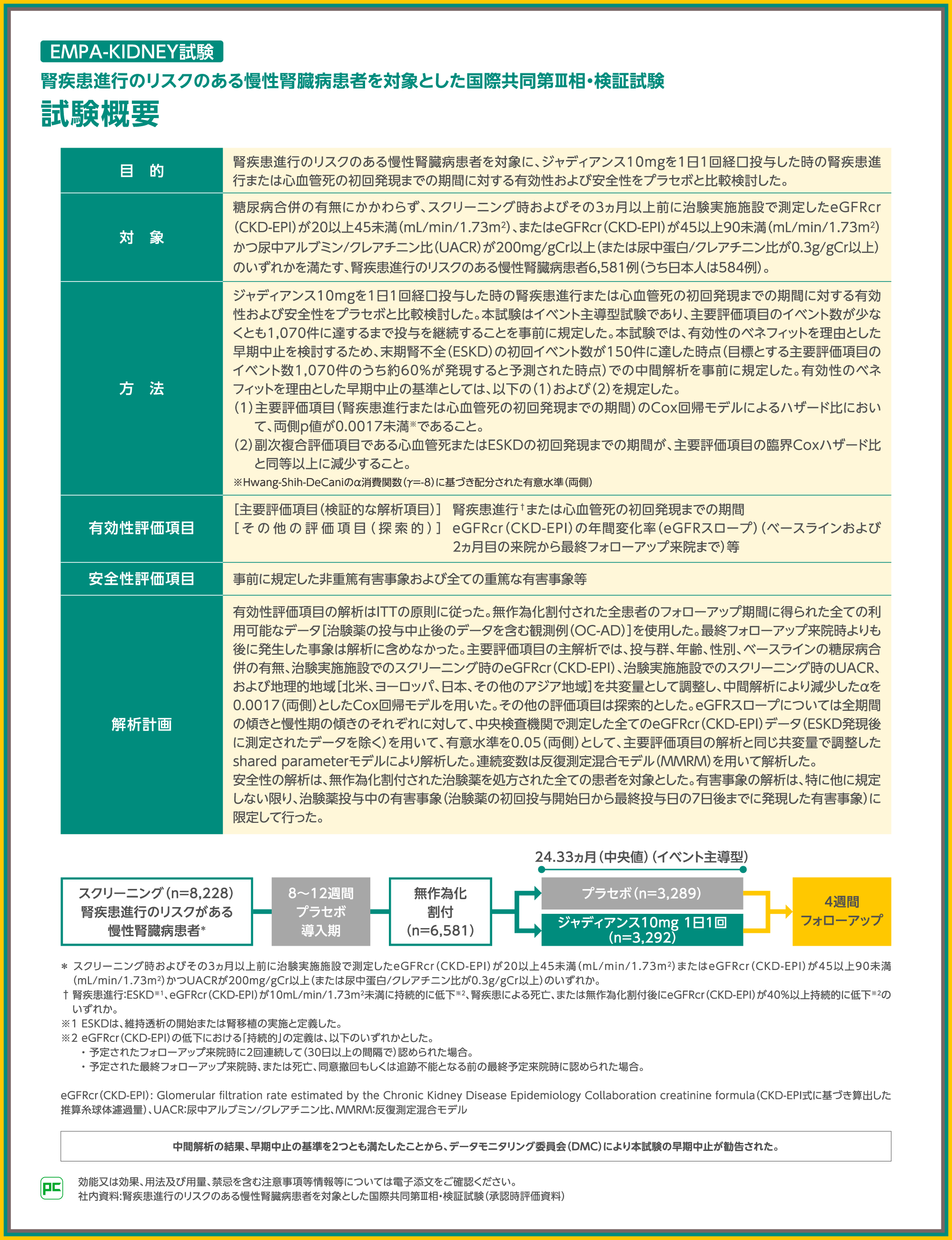 ジャディアンスでは、CKDに対する有効性を検証したEMPA-KIDNEY試験が評価され、ジャディアンス10mgの効能又は効果として慢性腎臓病※の追加が承認されました。