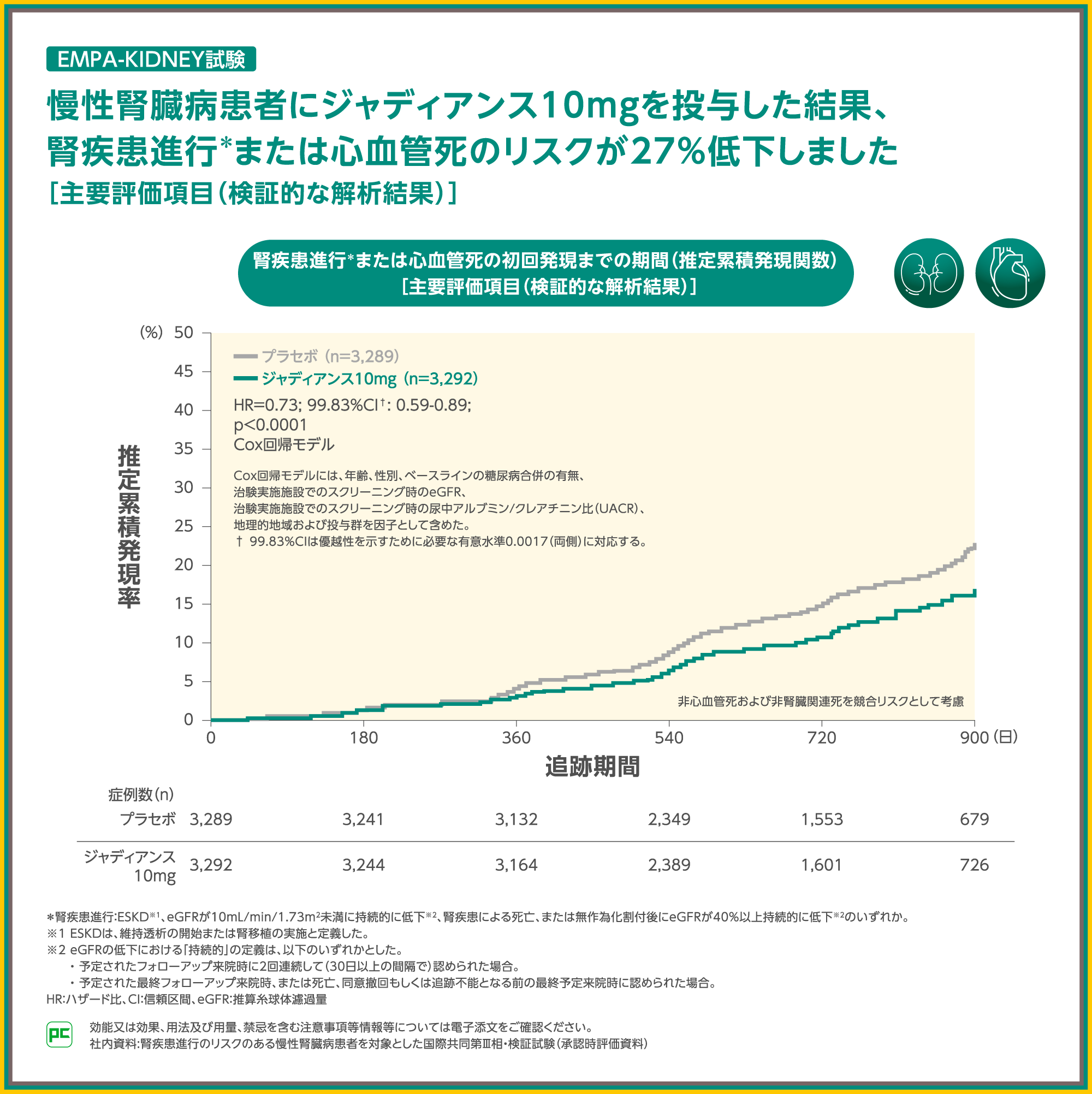 CKDにおける腎疾患進行または心血管死のプラセボ群に対するジャディアンス10mg群のハザード比は0.73(99.83%CI:0.59~0.89)、p<0.0001(Cox回帰モデル)であり、ジャディアンス10mg群の優越性が検証されました(検証的な解析結果)。