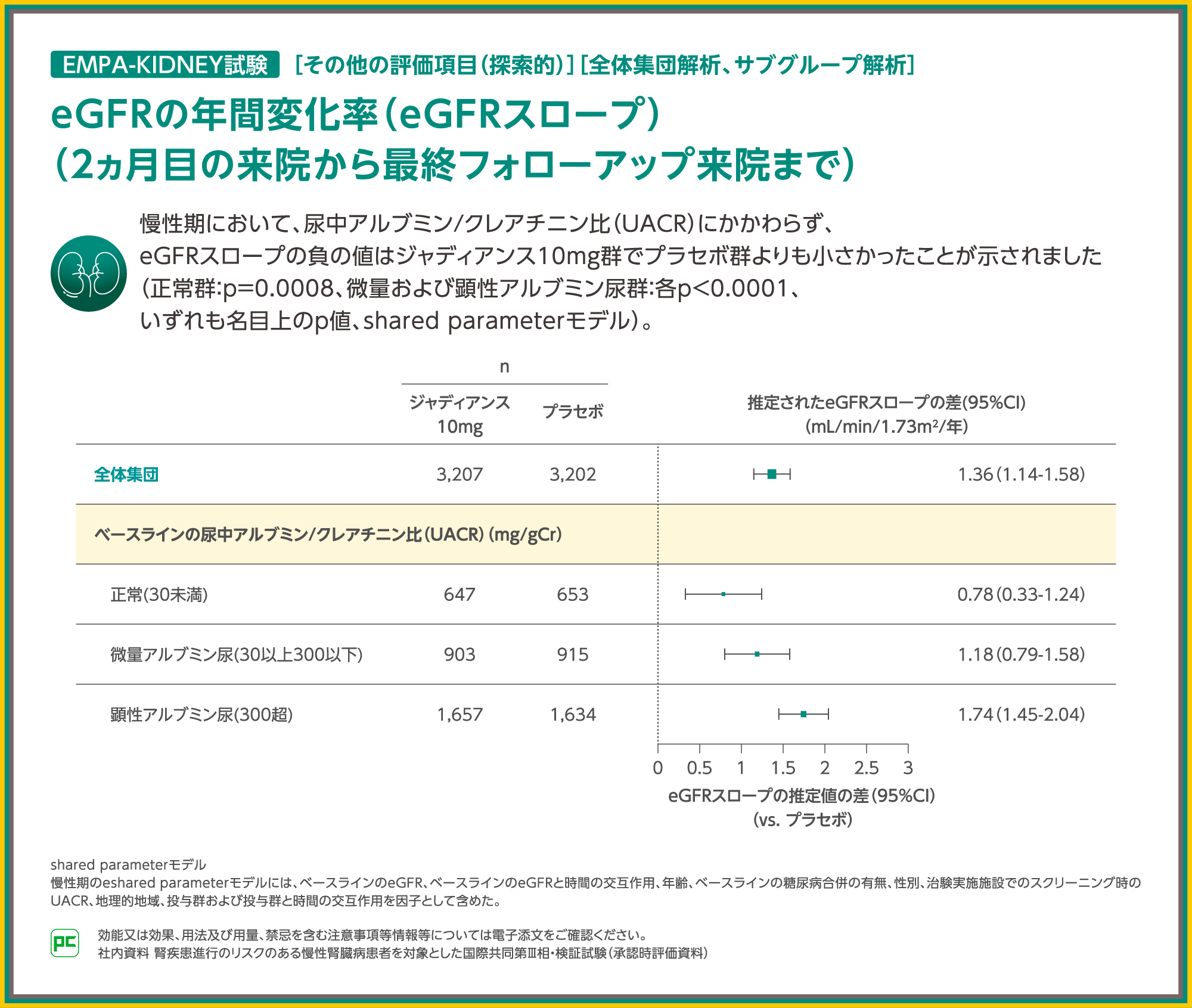 eGFRスロープについての事前規定されたUACR別のサブグループ解析では、慢性期において、UACRにかかわらず、eGFRスロープの負の値はジャディアンス10mg群でプラセボ群よりも小さかったことが示されました(正常群:p=0.0008、微量および顕性アルブミン尿群:各p<0.0001、いずれも名目上のp値、shared parameterモデル)。