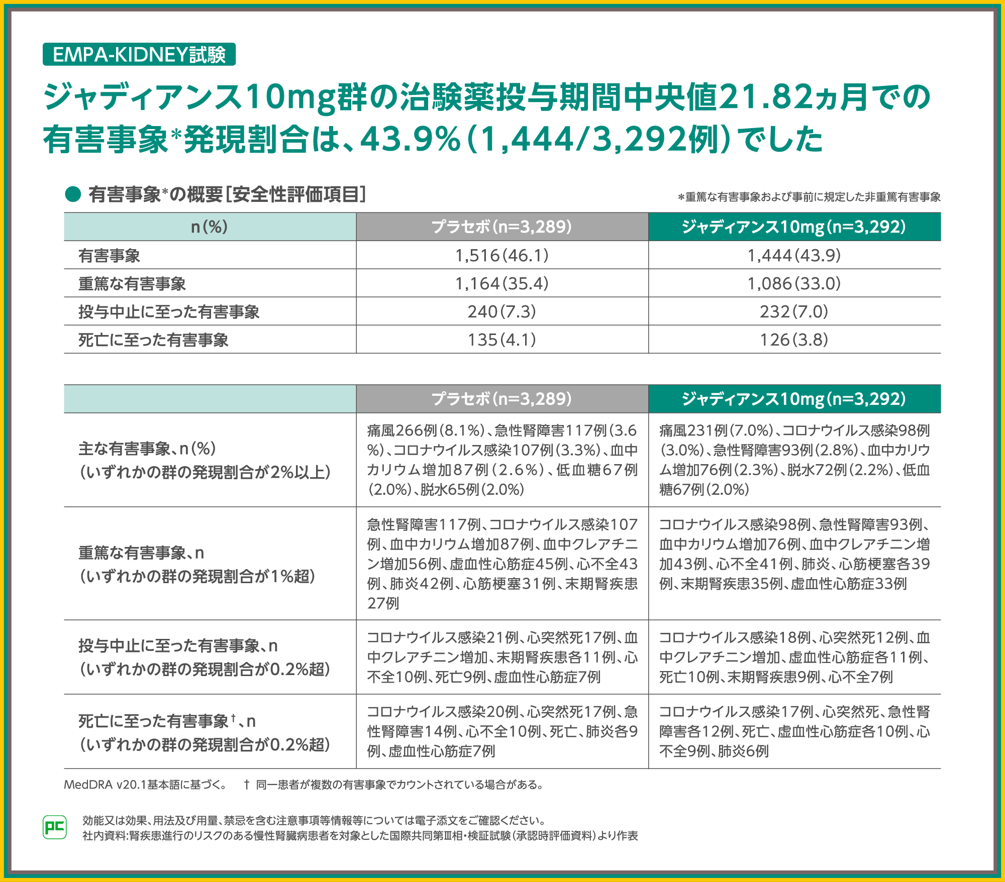 EMPA-KIDNEY試験では、安全性評価項目としての有害事象を、事前に規定した非重篤有害事象および全ての重篤な有害事象に限定して収集した結果、それらの発現割合はジャディアンス10mg群で43.9%(1,444/3,292例)、プラセボ群で46.1%(1,516/3,289例)でした。