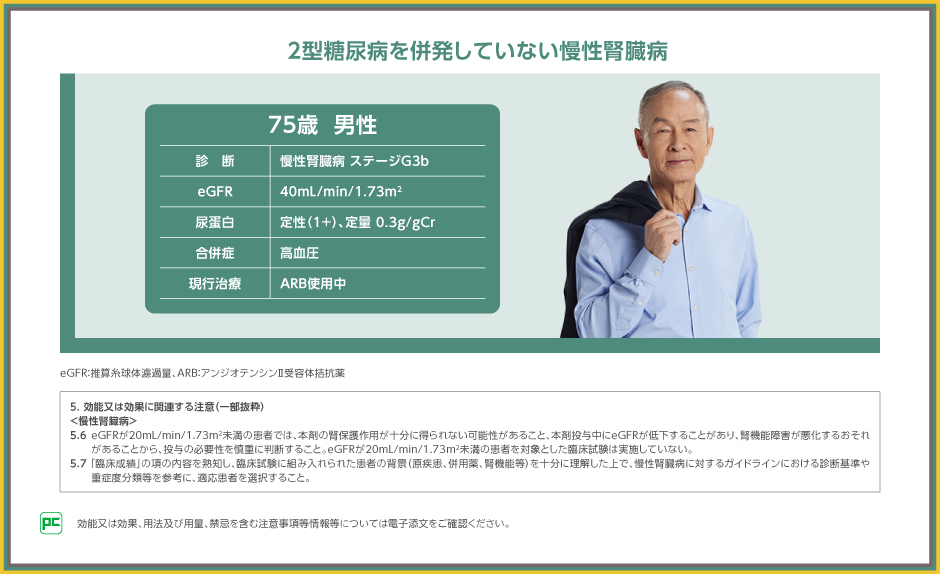 図に示すような年齢75歳のCKD患者の治療においては、透析などの末期腎不全を見据えた治療だけでなく、心不全の管理を考慮したCKD治療が重要であると考えられます。