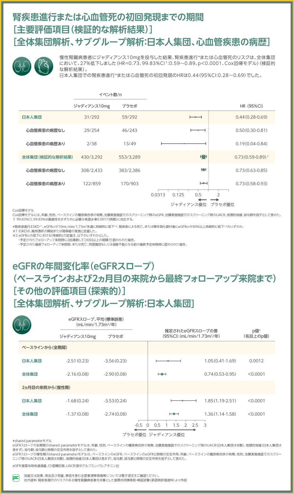 また、全体集団でのeGFRスロープ(mL/min/1.73m2/年)は、ベースラインから最終フォローアップ来院まで(全期間)において、プラセボ群-2.90に対してジャディアンス10mg群-2.16、2ヵ月目の来院から最終フォローアップ来院まで(慢性期)において、プラセボ群-2.74に対してジャディアンス10mg群-1.37であり、いずれもジャディアンス10mg群はプラセボ群に対してeGFRスロープの低下が小さかったことが示されました(いずれもp<0.0001、名目上のp値、shared parameterモデル)。