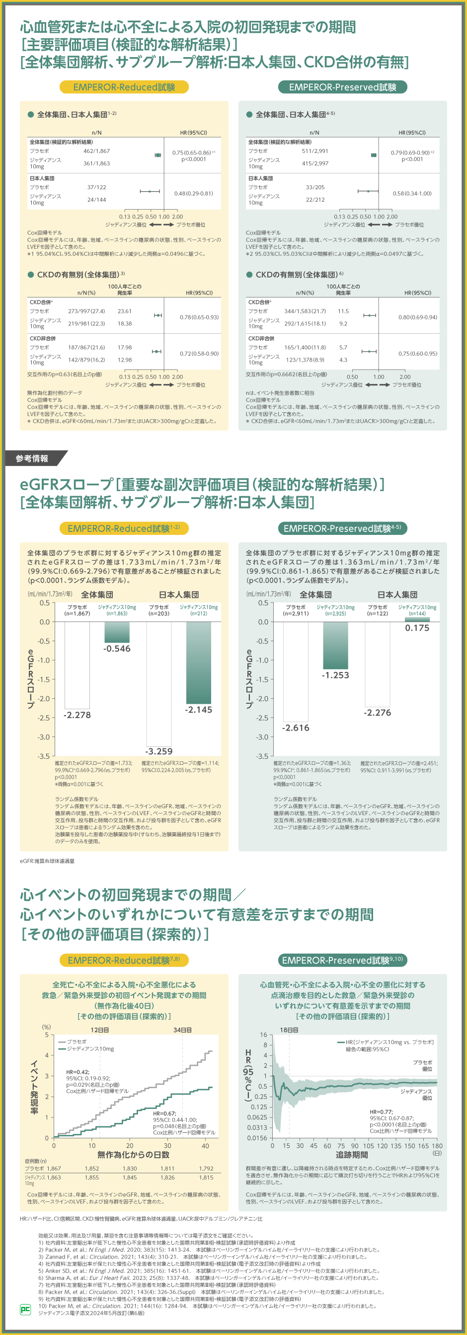 また、ジャディアンスが有効性を示すまでの期間を検討するために行った解析では、EMPEROR-Reduced試験において、全死亡・心不全による入院・心不全悪化による救急/緊急外来受診の初回イベント発現までの期間(無作為化後40日)のプラセボ群に対するジャディアンス10mg群のハザード比は、無作為化後12日目において0.42(95%CI:0.19~0.92)、p=0.029(Cox比例ハザード回帰モデル、名目上のp値)でした。EMPEROR-Preserved試験において、心血管死・心不全による入院・心不全の悪化に対する点滴治療を目的とした救急/緊急外来受診のいずれかについて有意差を示すまでの期間のプラセボ群に対するジャディアンス10mg群のハザード比は、追跡期間18日目において0.77(95%CI:0.67~0.87)、p<0.0001(Cox比例ハザード回帰モデル、名目上のp値)でした。