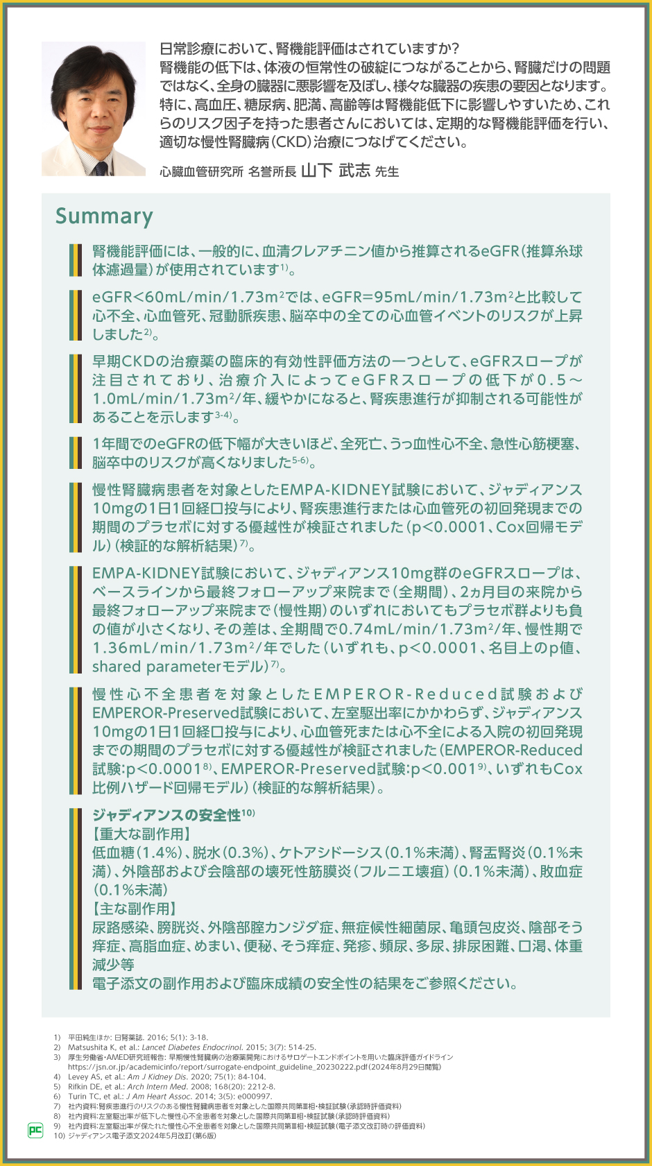 腎機能の低下は様々な疾患の併発につながることから、日常診療でeGFRの低下を緩やかにすることの重要性とその方法について、山下武志先生にご紹介いただきました。