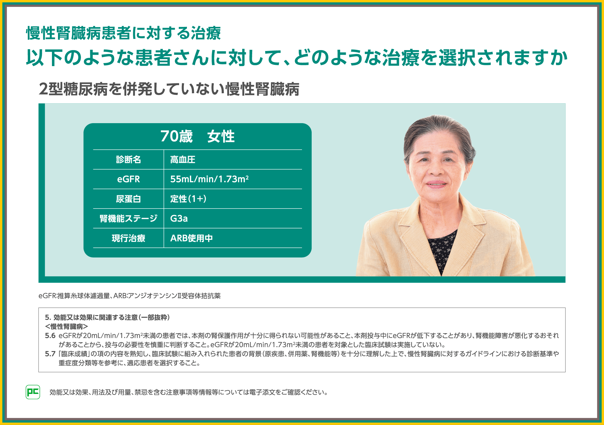 これらのリスク因子をお持ちの患者さんにおいては、特に定期的な腎機能評価を行い、適切な治療につなげましょう。
