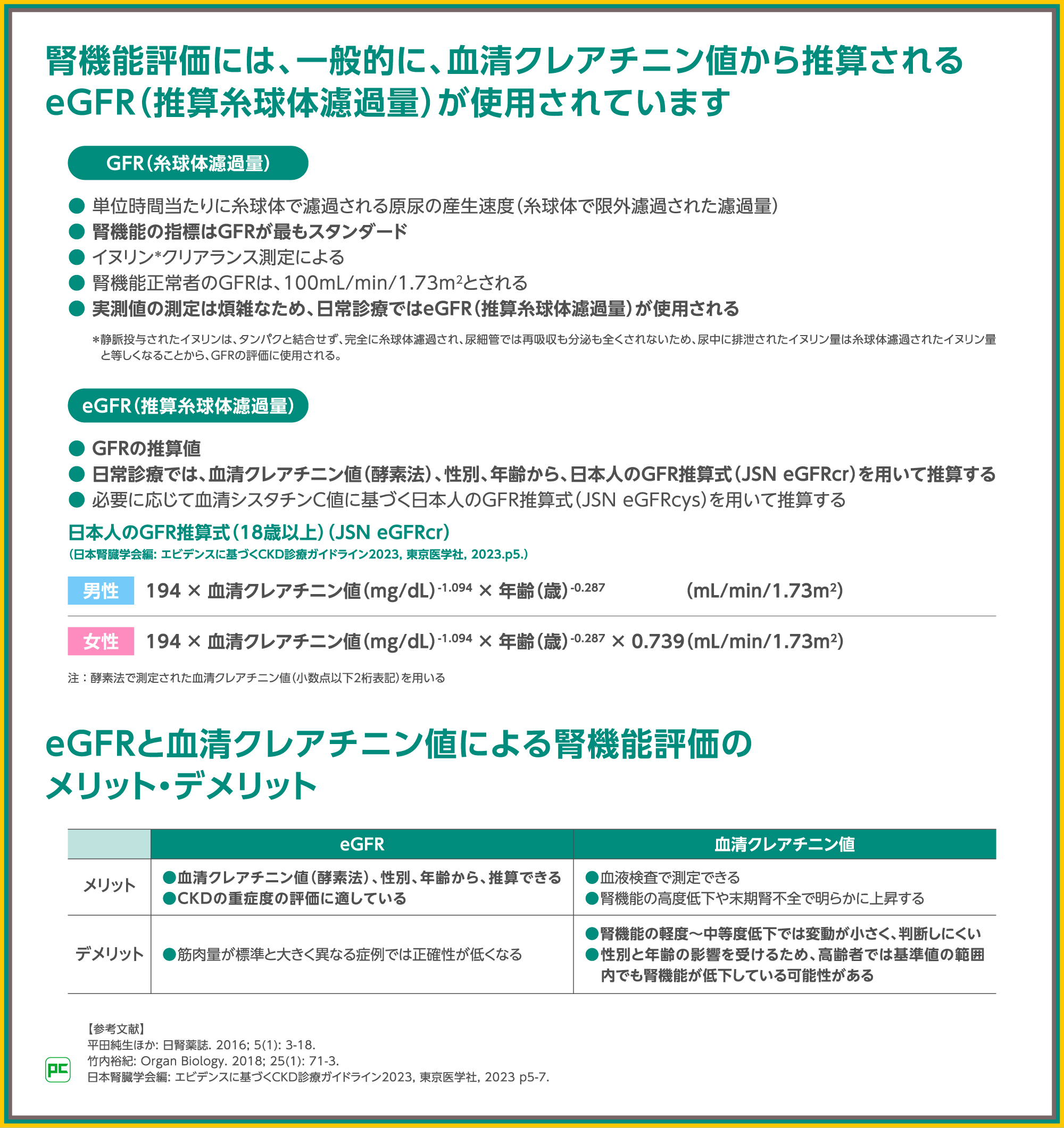腎機能評価には、一般的に、eGFRが使用されています。