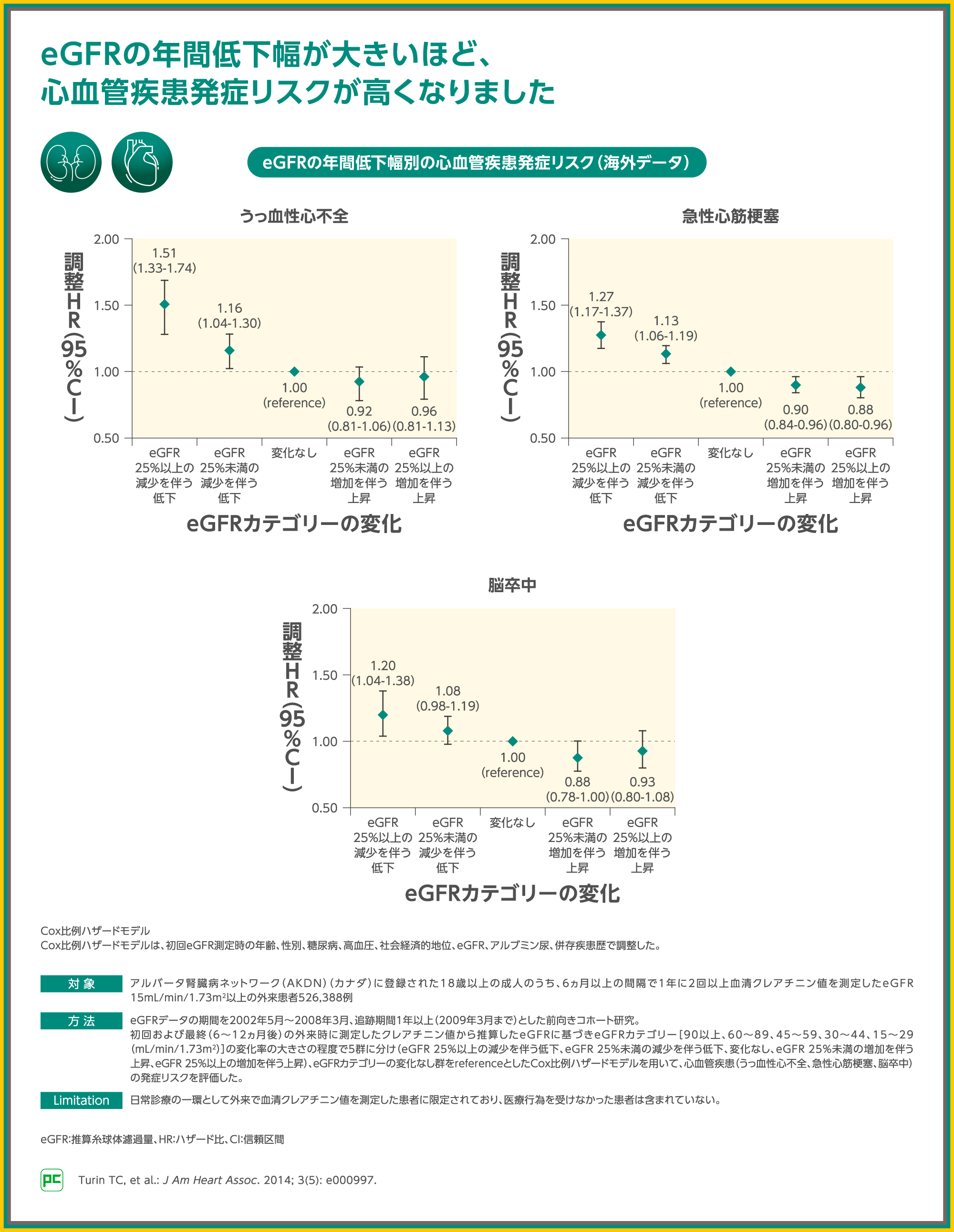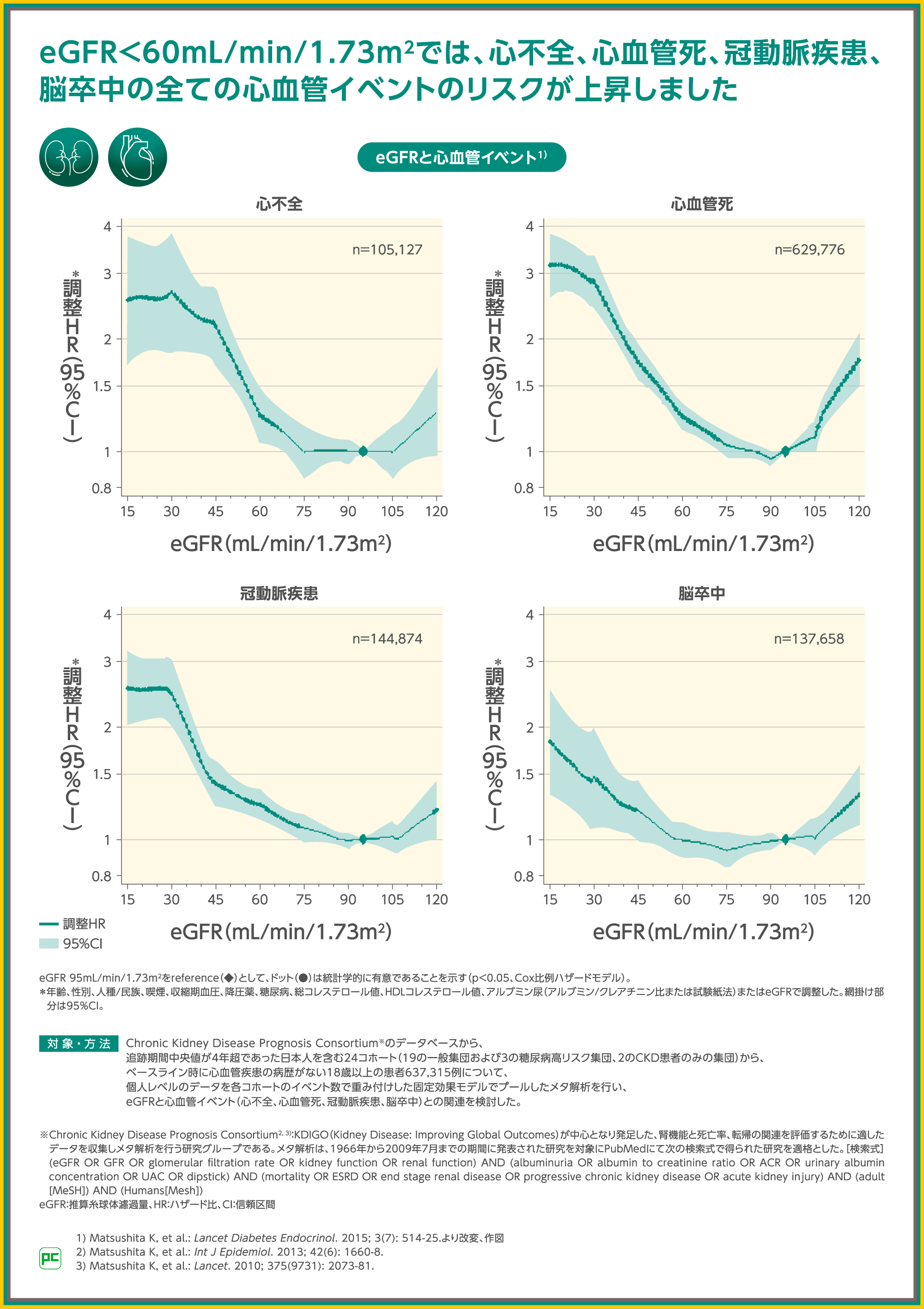 一般集団コホートを含むメタ解析では、eGFR 60mL/min/1.73m2未満になると、eGFR正常または高値の範囲である95mL/min/1.73m2と比較して心不全、心血管死、冠動脈疾患 、脳卒中の全ての心血管イベントのリスクが上昇したことが示されました。