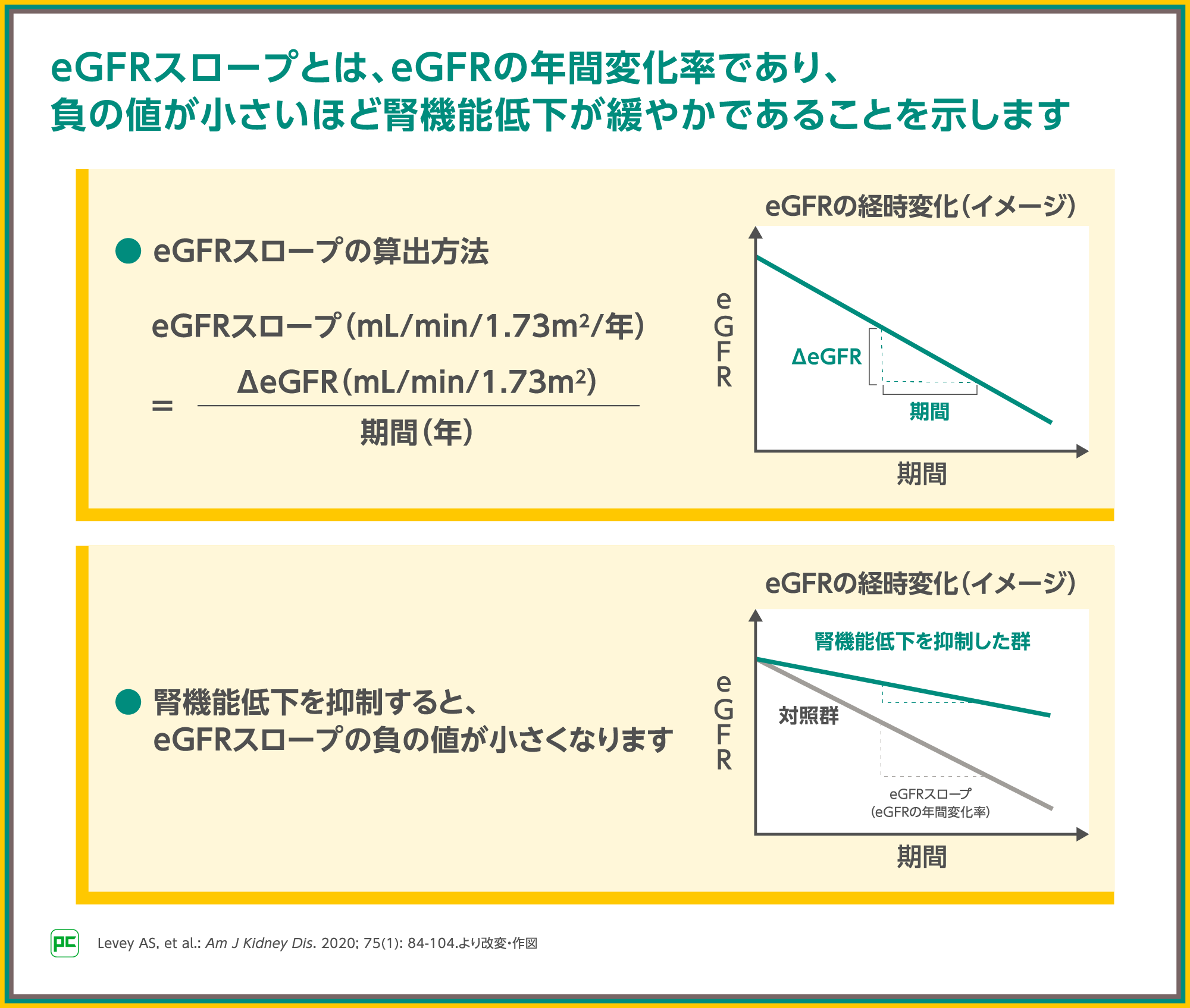 複数の時点でeGFRが得られている患者さんに対し、eGFRの差を期間で除することで得られます。