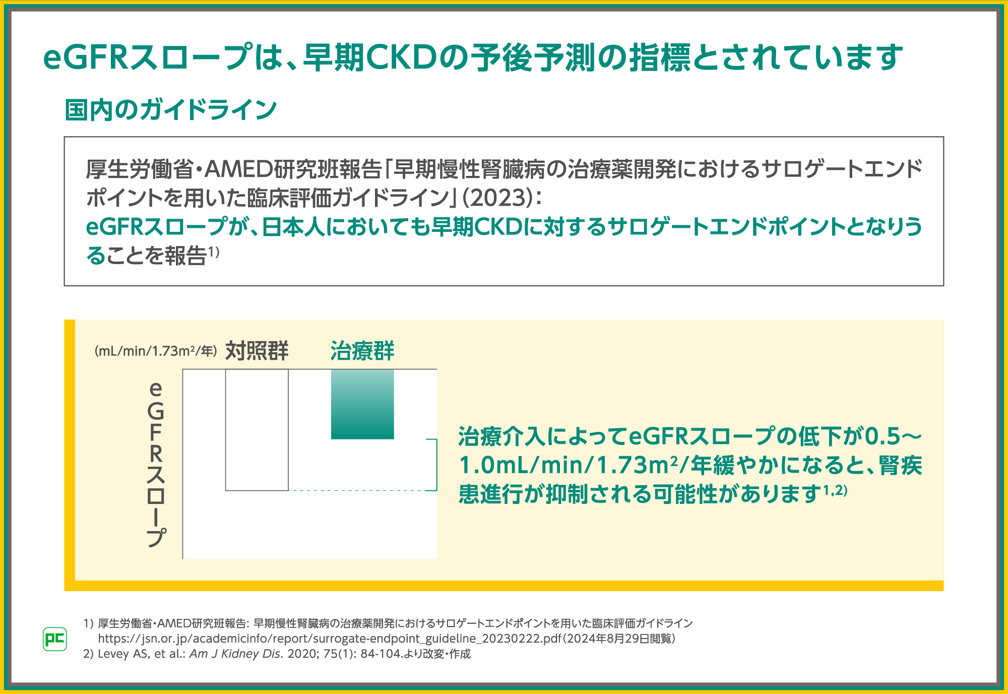 なお、eGFRスロープの早期CKDの予後予測の指標としての基準は、治療介入によってeGFRスロープの低下が0.5~1.0mL/min/1.73m2/年、緩やかになることとされています。