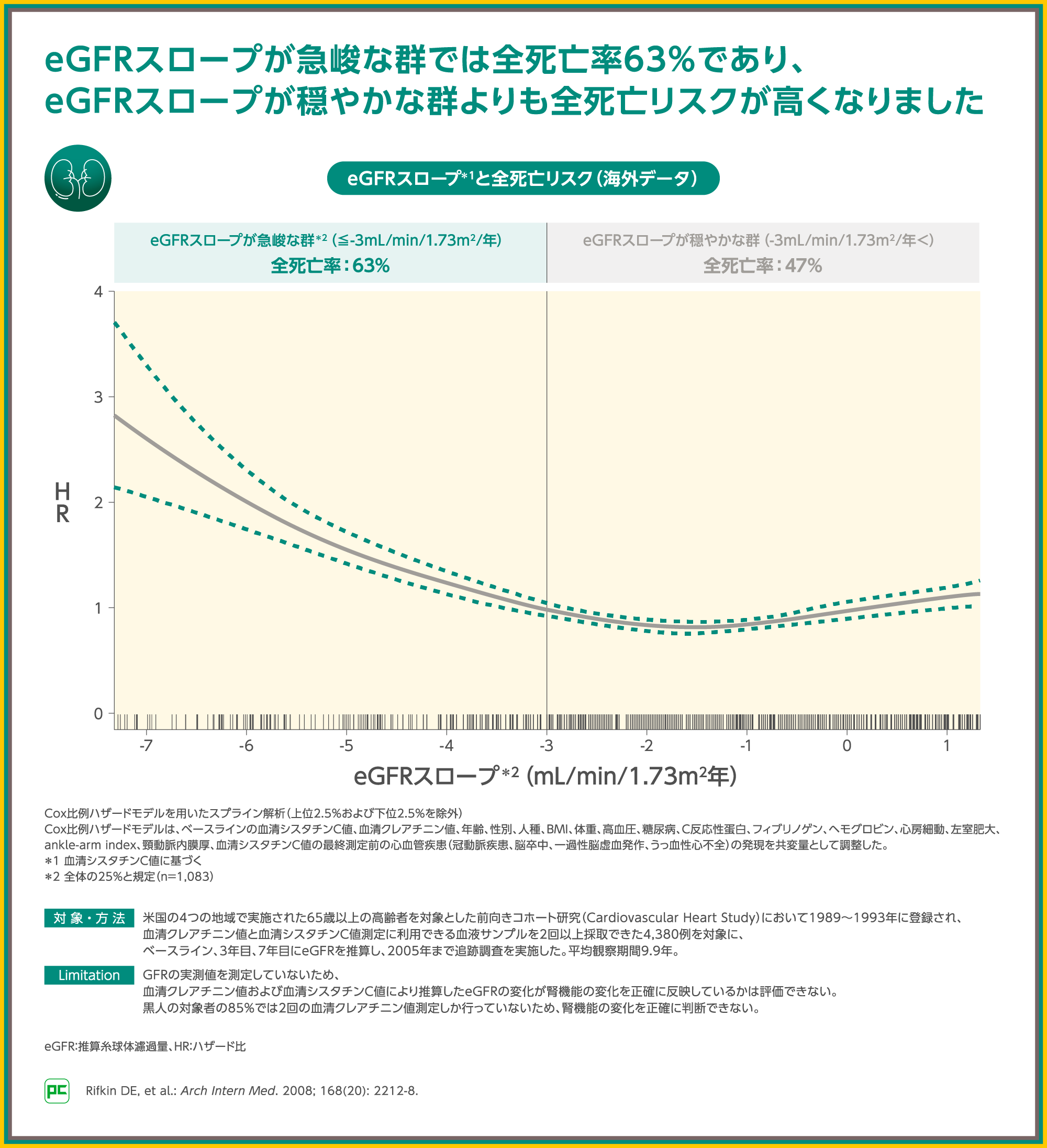 米国で65歳以上の高齢者を対象に、eGFRスロープと全死亡リスクの相関を検討した追跡調査では、eGFRスロープが-3mL/min/1.73m2/年以下の急峻な群では全死亡率63%、それよりも緩やかな-3mL/min/1.73m2/年超の群で47%と、eGFRスロープが急峻な群で全死亡率が高くなりました。また、図のように、eGFRスロープの負の値が大きいほど、全死亡リスクは高くなることが示されました。