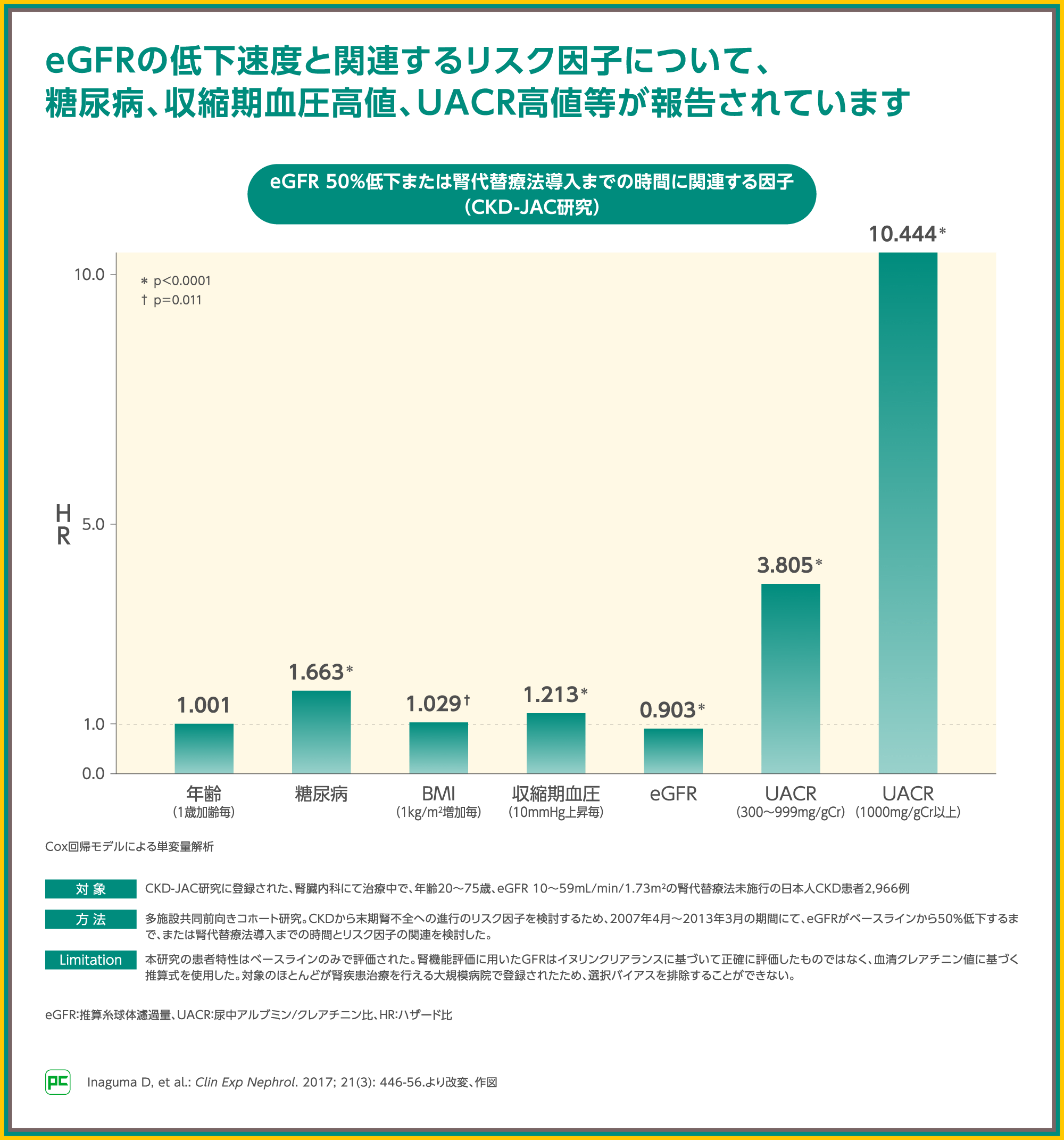なお、eGFRの低下速度についてのリスク因子について、私は、年齢、糖尿病合併、BMI高値、高血圧、eGFR、UACRに注目しています。