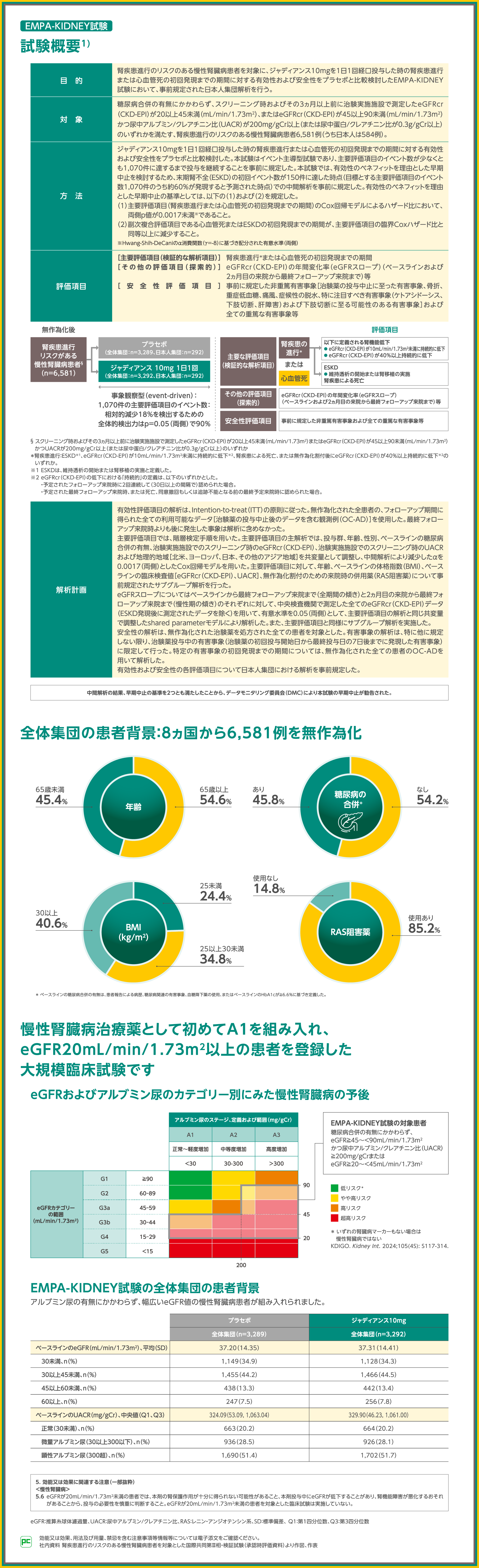 慢性腎臓病*の効能又は効果の追加承認を受けたジャディアンスでは、慢性腎臓病患者を対象として、ジャディアンス10mgを1日1回経口投与した時の有効性および安全性をプラセボと比較検討するEMPA-KIDNEY試験が行われました。