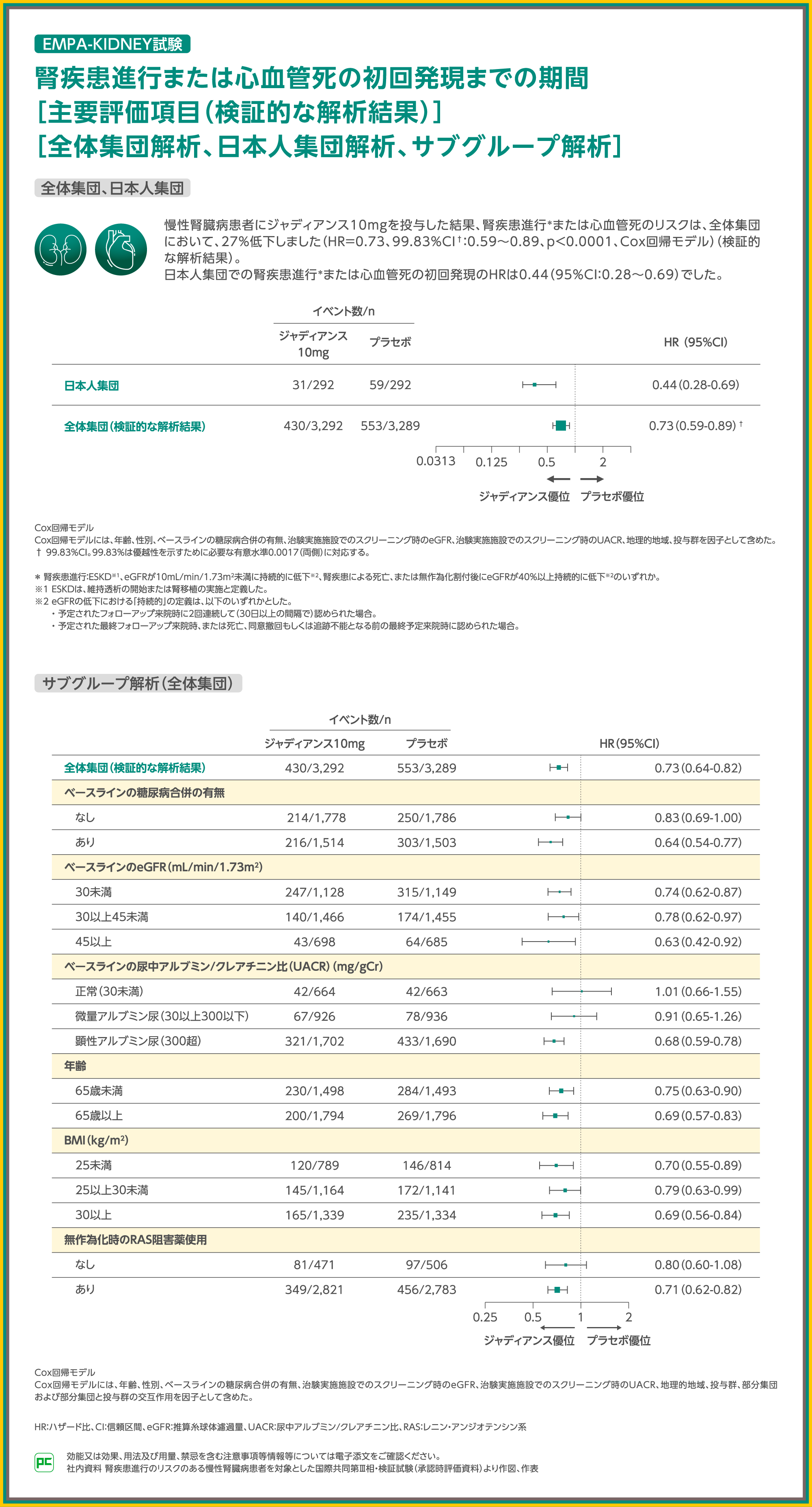 また、RAS阻害薬使用ありの群ではハザード比0.71となり、ジャディアンス10mg群とプラセボ群の間に有意差が認められました(p<0.0001、名目上のp値、Cox回帰モデル)。