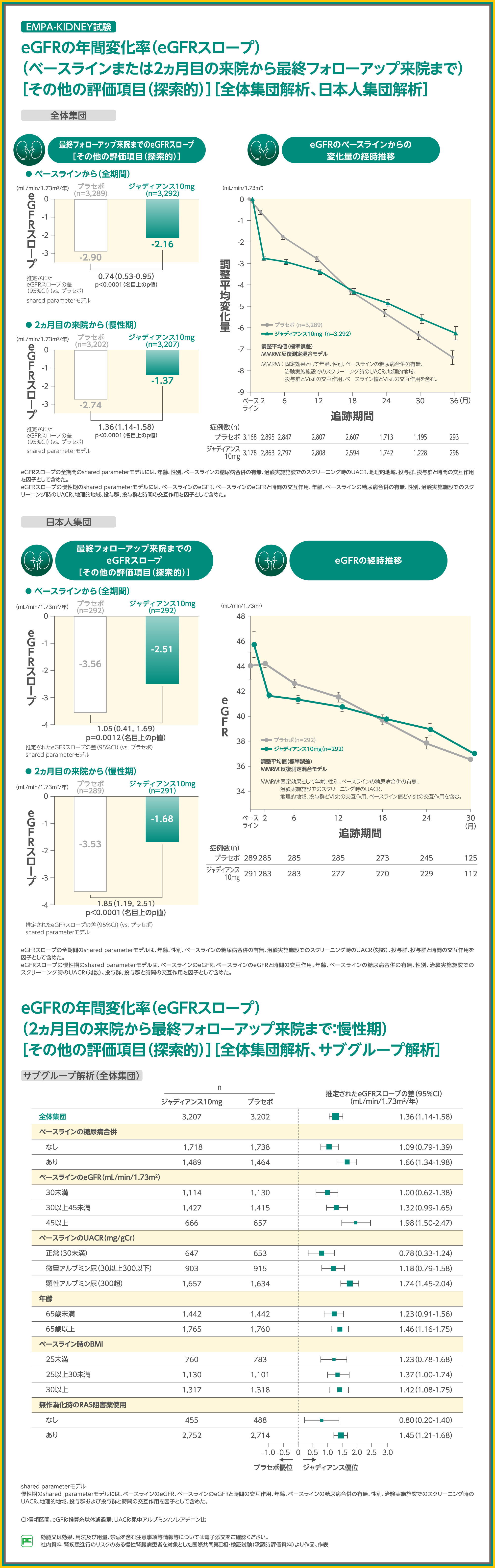 日本人集団では、全期間において、ジャディアンス10mg群ではプラセボ群よりも1.05mL/min/1.73m2/年、負の値が小さくなり(p=0.0012、名目上のp値、shared parameterモデル)、慢性期において、ジャディアンス10mg群ではプラセボ群よりも1.85mL/min/1.73m2/年、負の値が小さくなりました(p<0.0001、名目上のp値、shared parameterモデル)。