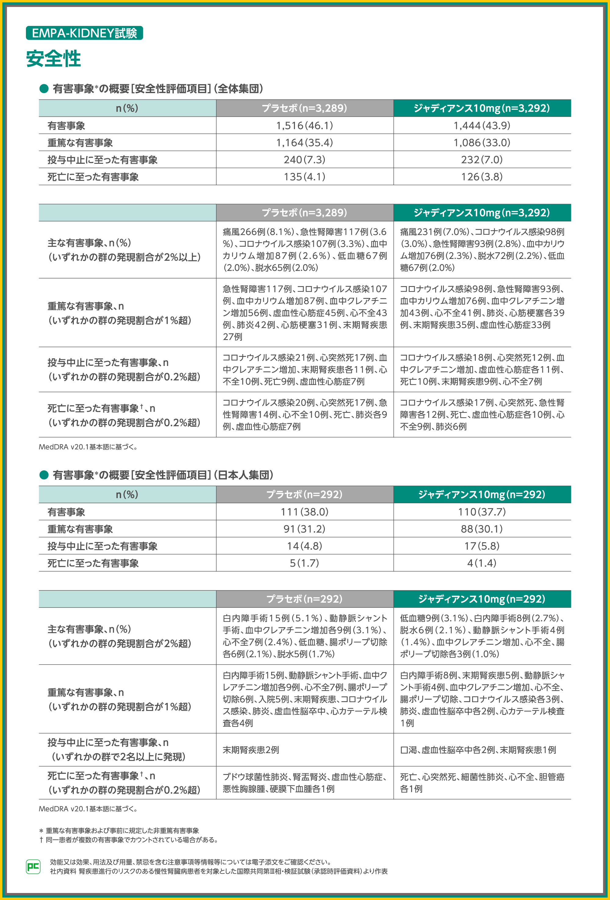 主な有害事象は、ジャディアンス10mg群で痛風231例(7.0%)、コロナウイルス感染98例(3.0%)、急性腎障害93例(2.8%)等、プラセボ群で痛風266例(8.1%)、急性腎障害117例(3.6%)、コロナウイルス感染107例(3.3%)等でした。また、重篤な有害事象は、ジャディアンス10mg群でコロナウイルス感染98例、急性腎障害93例、血中カリウム増加76例等、プラセボ群で急性腎障害117例、コロナウイルス感染107例、血中カリウム増加87例等でした。投与中止、死亡に至った有害事象は表のとおりでした。