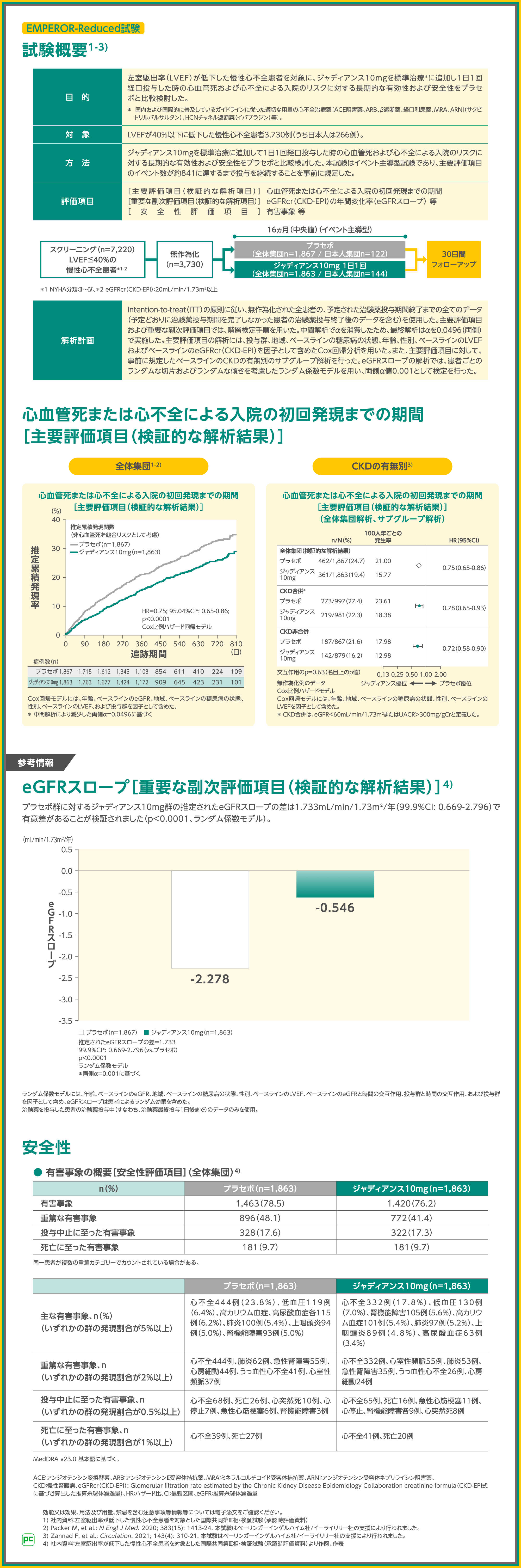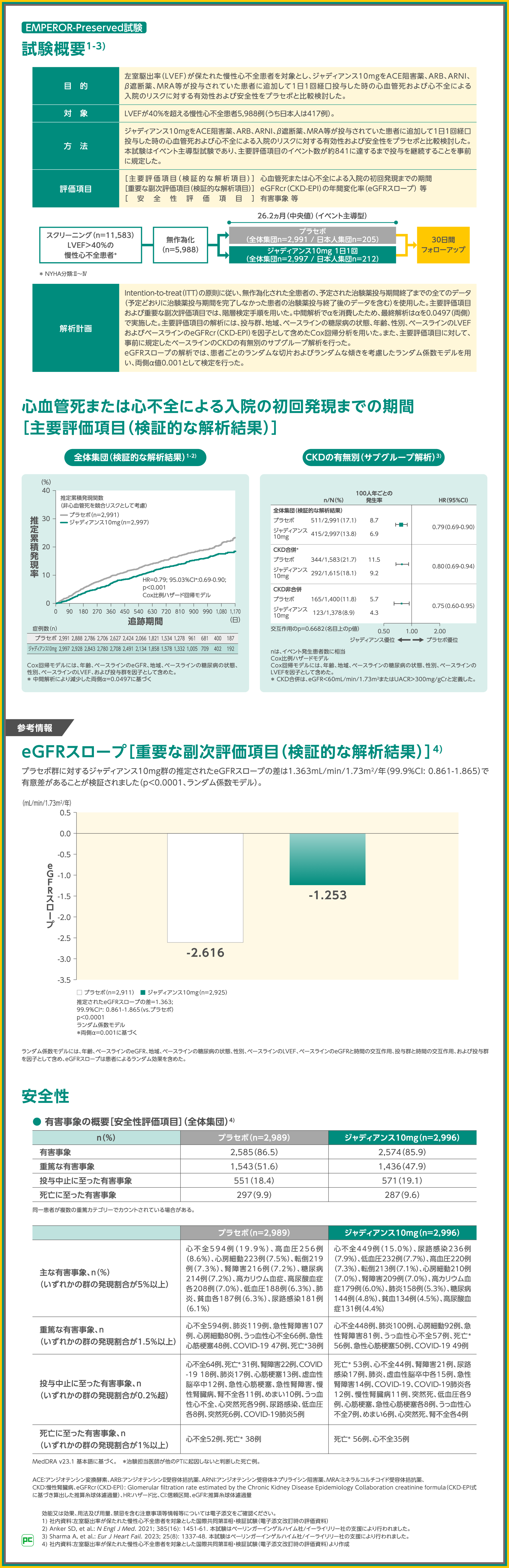 また、LVEF>40%の慢性心不全患者を対象としたEMPEROR-Preserved試験でも、ジャディアンス10mgを1日1回経口投与した時の有効性および安全性についてプラセボ群との比較検討を行いました。