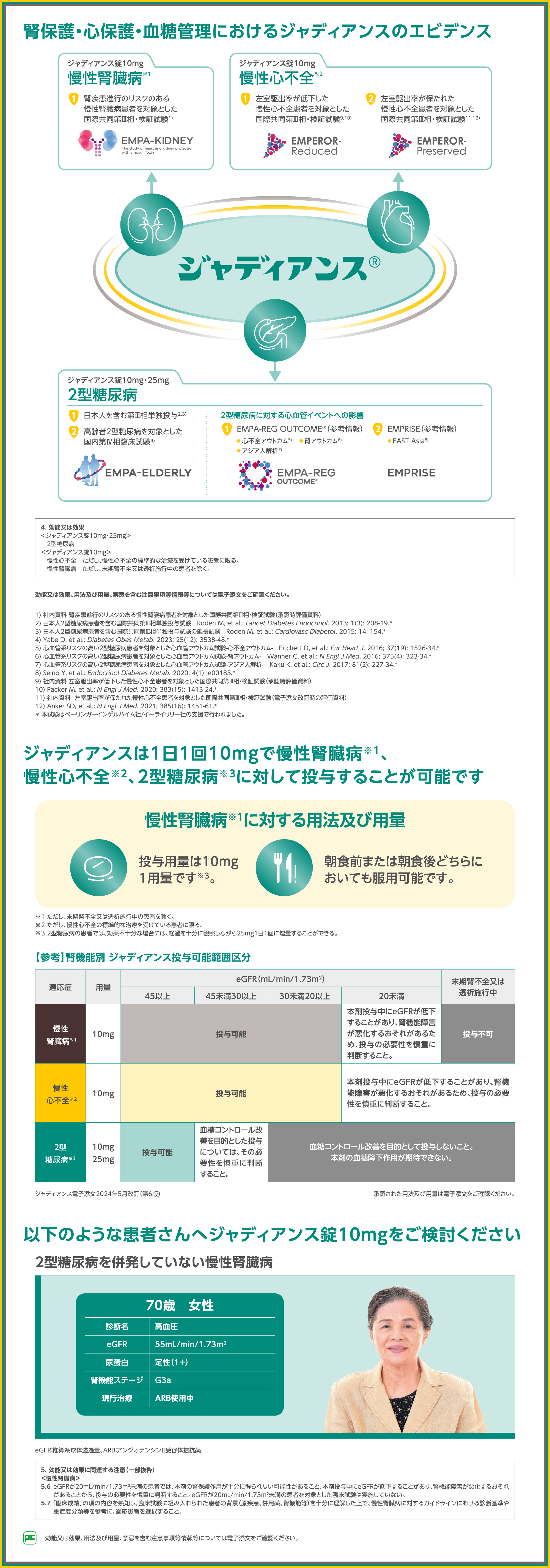 今回紹介した、EMPA-KIDNEY試験、EMPEROR-Reduced試験、EMPEROR-Preserved試験をはじめとして、ジャディアンスは、慢性腎臓病※1、慢性心不全※2、2型糖尿病に対する適応とエビデンスを有しています。