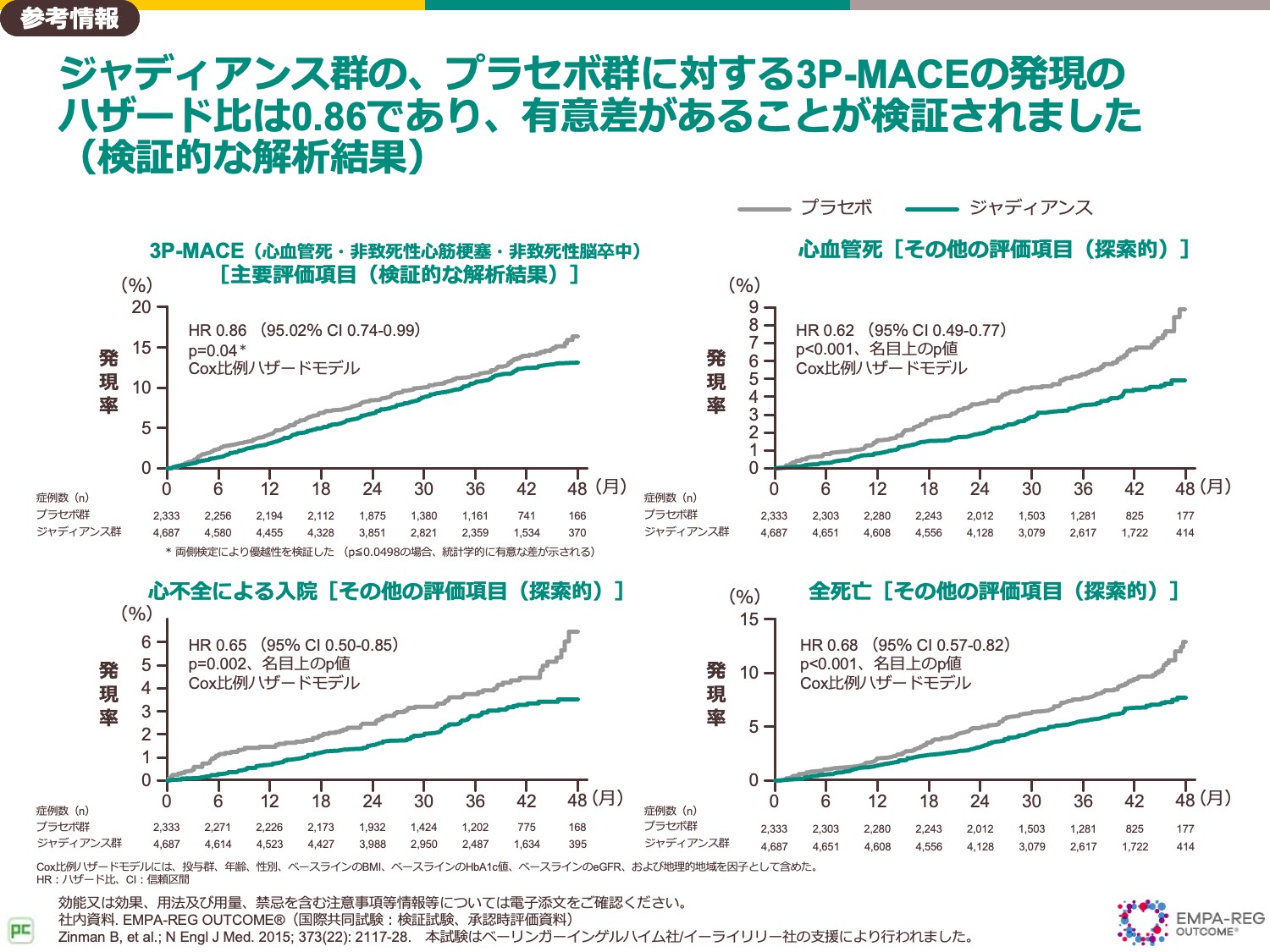 そして副次評価項目である心血管死、全死亡、心不全による入院、これらいずれの項目においても、プラセボ群に対してジャディアンス群で有意なイベントリスク抑制が示されました。
