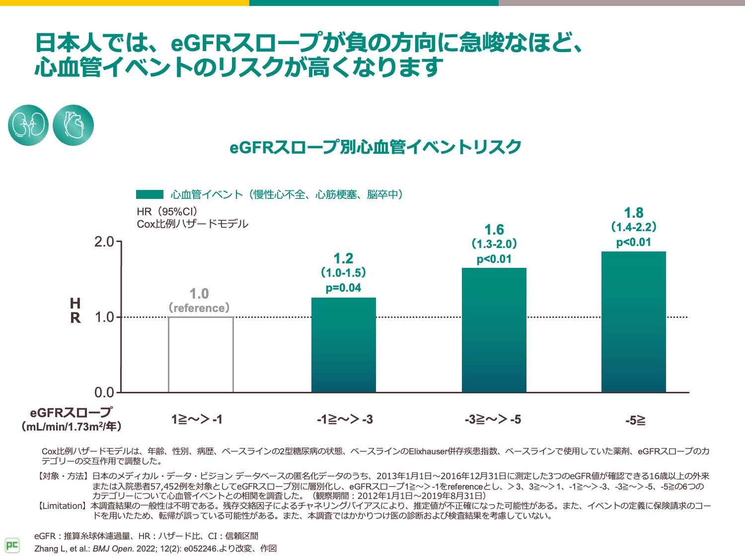 日本人のデータベースを利用した調査では、eGFRスロープが-1mL/min/1.73m2から1mL/min/1.73m2である場合と比べ、-1mL/min/1.73m2以下の場合、すなわち負の方向に急峻なほど心血管イベントのリスクが高いことが示されました4)。