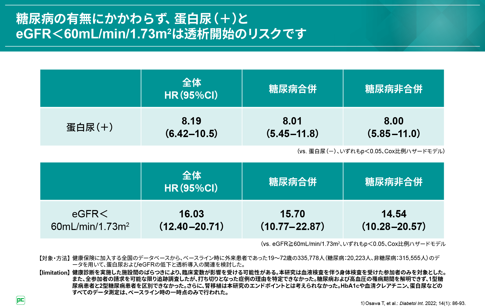 さらに、蛋白尿およびeGFRの低下による透析導入リスクを検討した日本の研究では、糖尿病の有無にかかわらず、蛋白尿(+)とeGFR<60mL/min/1.73m2は透析導入の独立した予測因子だったことが報告されています。