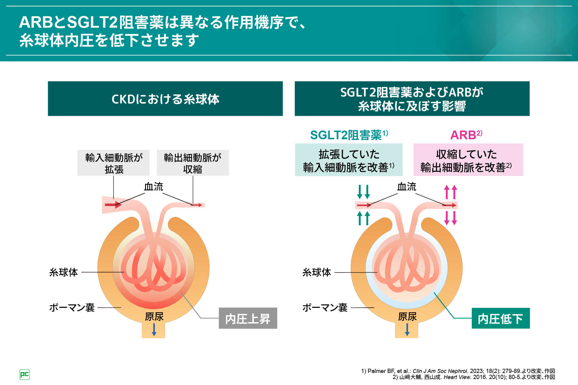 このARBとSGLT2阻害薬はいずれも糸球体内圧を低下させると考えられていますが、その作用機序は異なります。