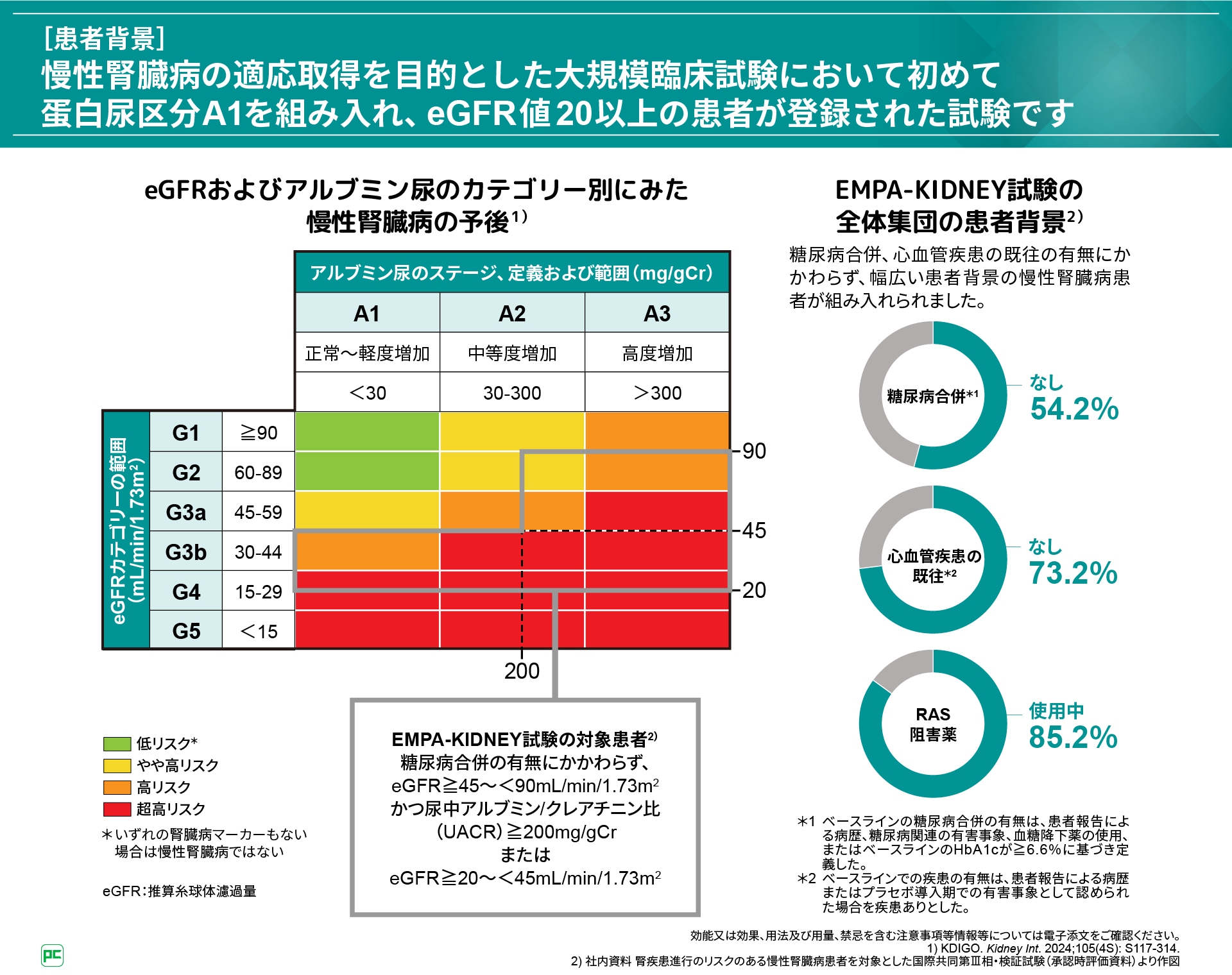 本試験は、CKDの適応取得を目的とした大規模臨床試験において初めて蛋白尿区分A1を組み入れ、eGFR値20以上の患者が登録された試験です。また、糖尿病合併、心血管疾患の既往、併用薬の有無にかかわらず、幅広い患者背景のCKD患者が組み入れられました。
