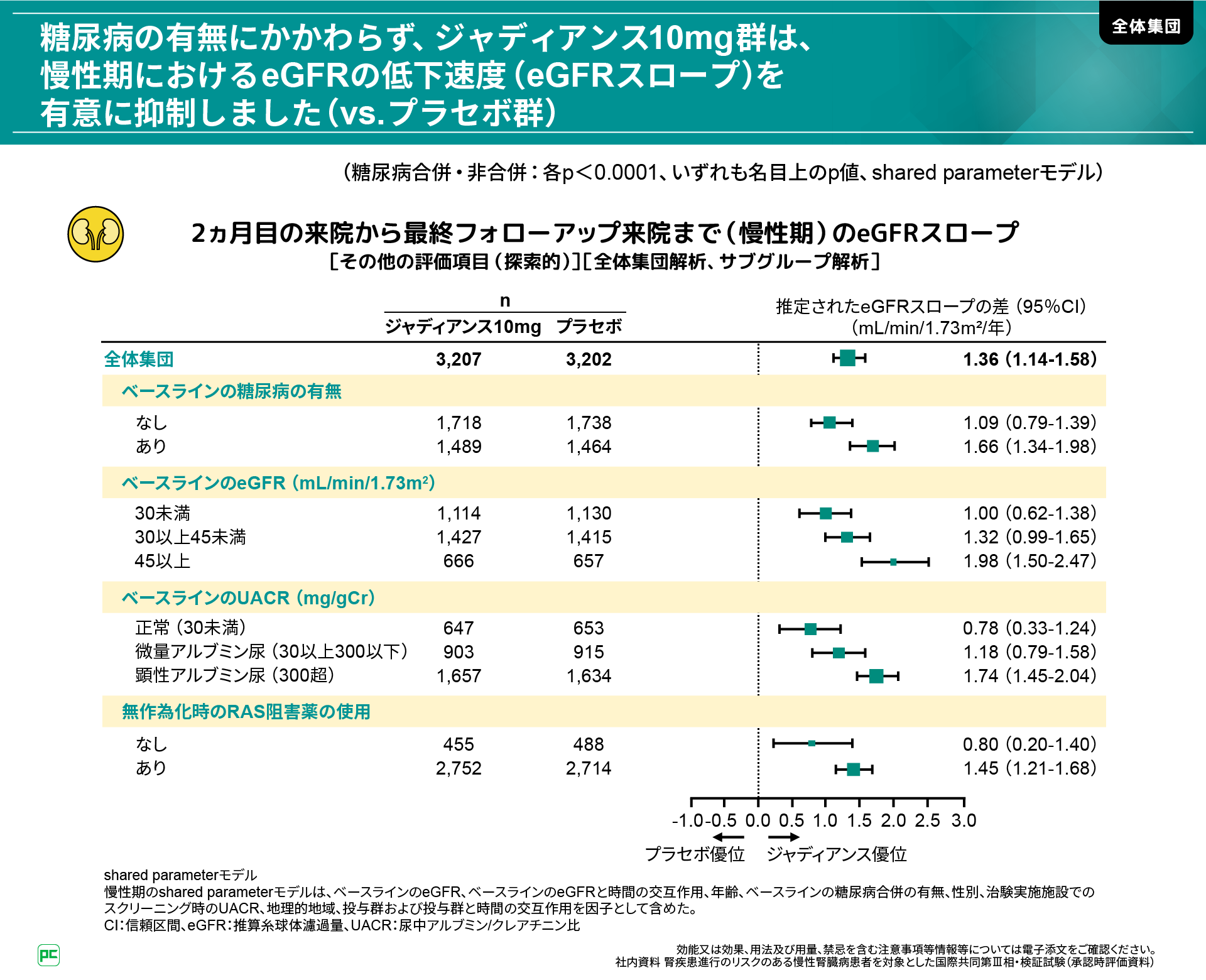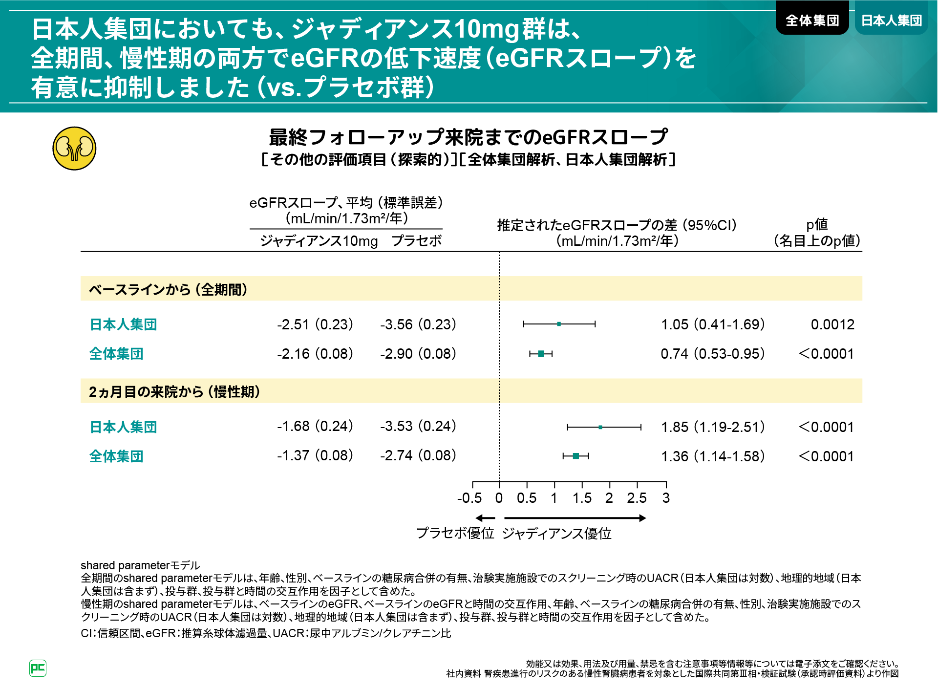 また、日本人集団においても、ジャディアンス10mg群はプラセボ群と比べて、全期間、慢性期の両方でeGFRスロープを有意に抑制しました(全期間:p=0.0012、慢性期:p<0.0001、いずれも名目上のp値、shared parameterモデル)。