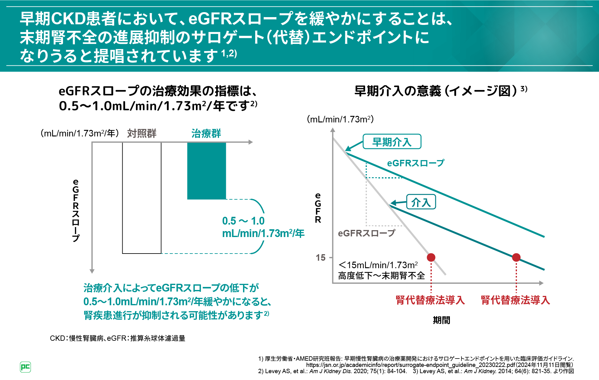 また、早期CKD患者において、eGFRスロープを緩やかにすることは、末期腎不全の進展抑制のサロゲート(代替)エンドポイントになりうると提唱されています。