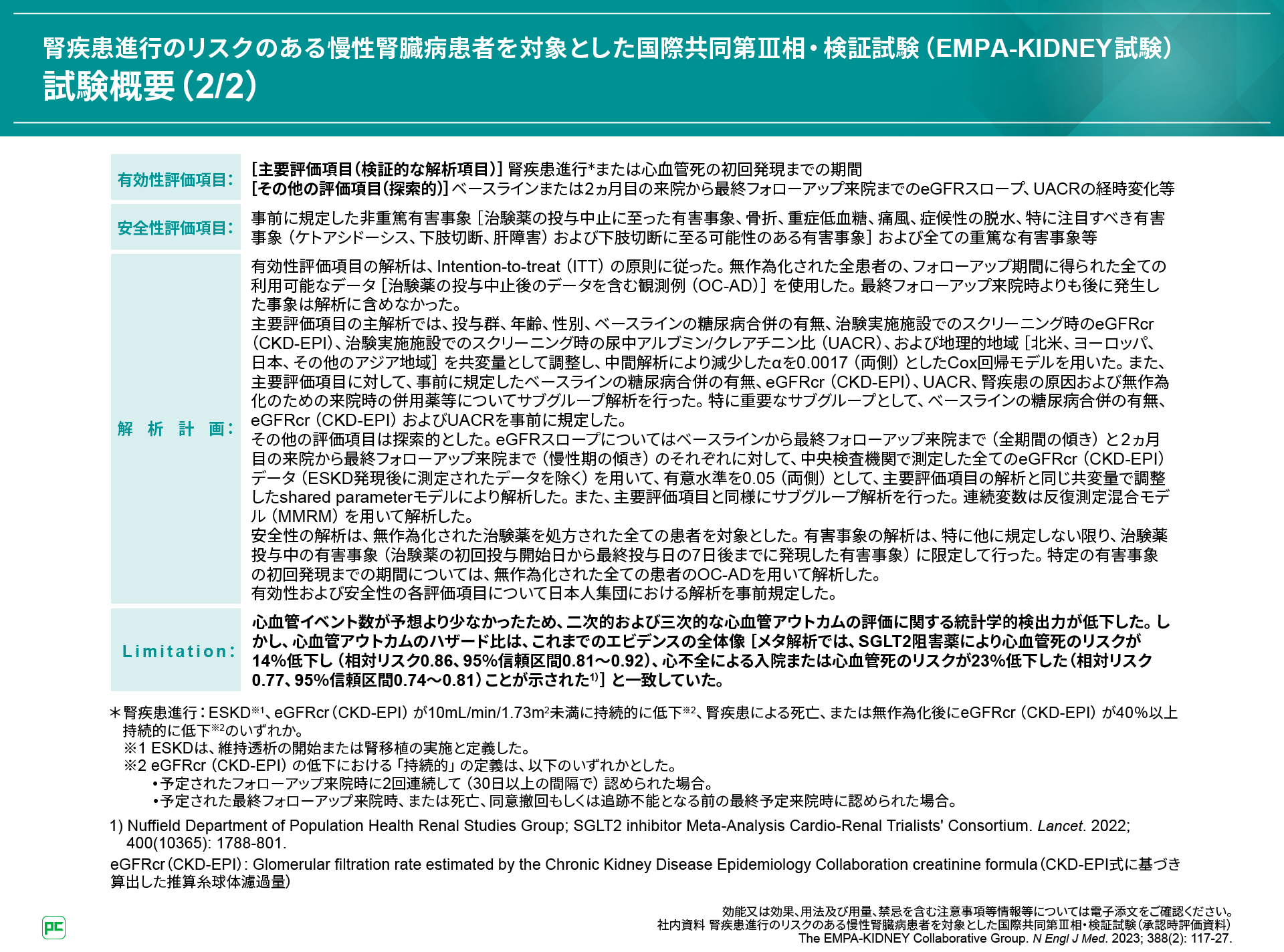 主要評価項目は、腎疾患進行または心血管死の初回発現までの期間でした。その他の評価項目、安全性評価項目、解析計画はご覧のとおりであり、有効性および安全性の各評価項目について日本人集団における解析が事前規定されていました。