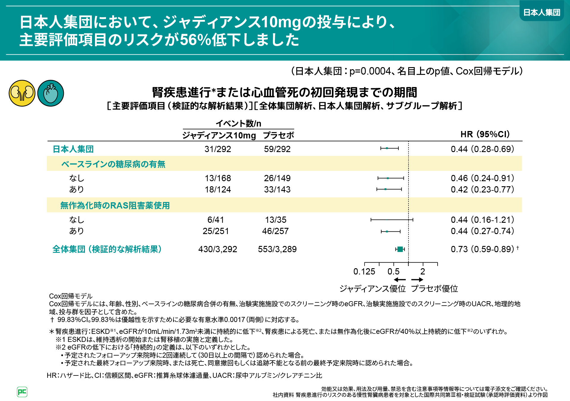 さらに日本人集団では、ジャディアンス10mgの投与により、主要評価項目のリスクが56%低下しました(95%CI:0.28-0.69、p=0.0004、名目上のp値、Cox回帰モデル)。