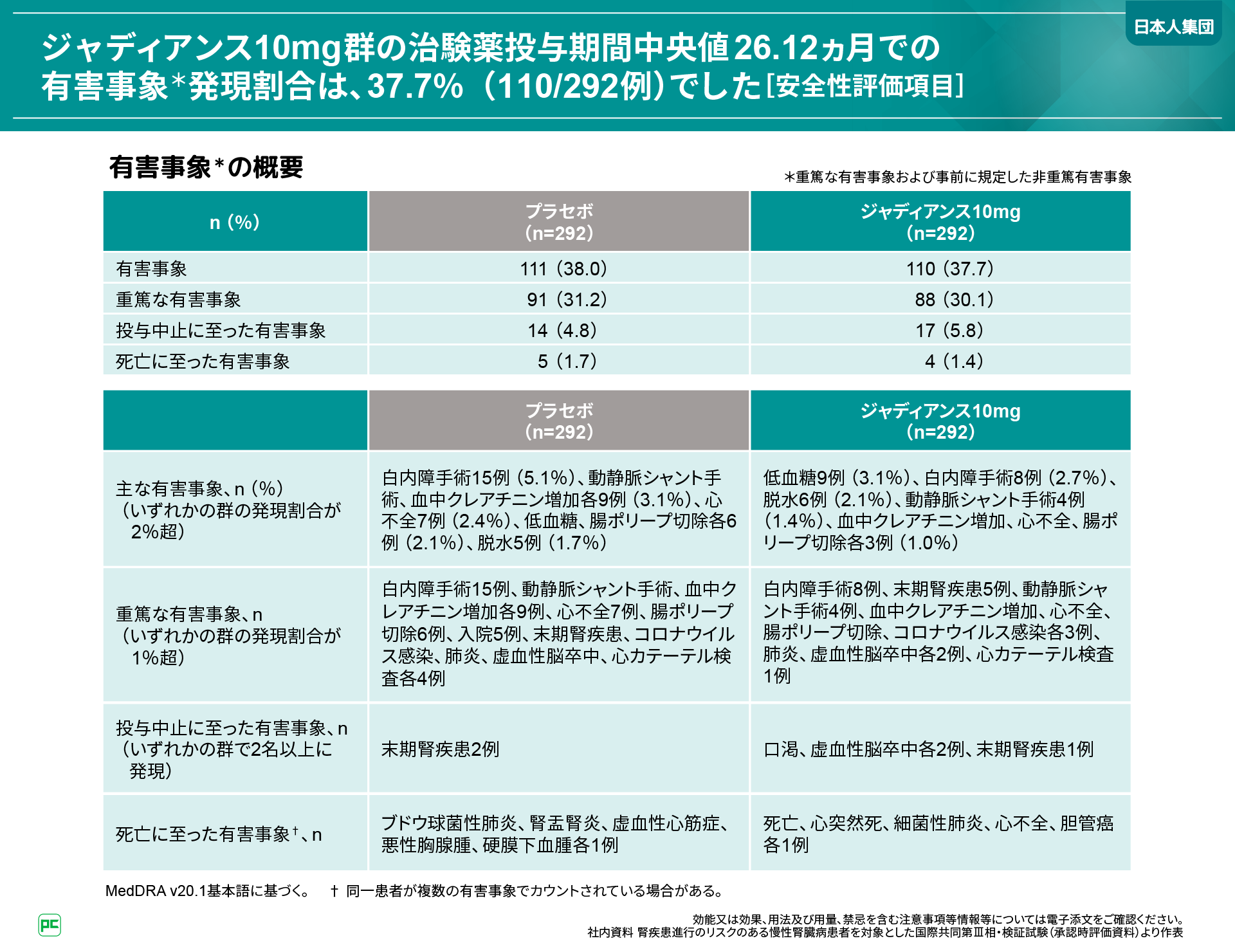重篤な有害事象は、ジャディアンス10mg群で白内障手術8例、末期腎疾患5例、動静脈シャント手術4例等、プラセボ群で白内障手術15例、動静脈シャント手術、血中クレアチニン増加各9例等でした。