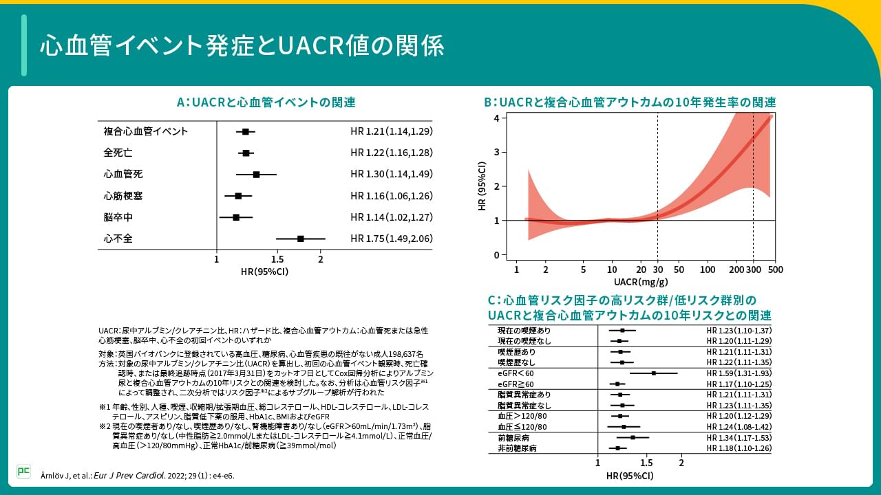 英国バイオバンクに登録されている高血圧、糖尿病、心血管疾患の既往がない成人198,637名を対象に、心血管イベントとアルブミン尿の指標である尿中アルブミン/クレアチニン比(UACR)の関連を検討した研究では、心血管イベントのうち心不全とアルブミン尿の関係が強いことが示唆されました(図1)。すなわち、心血管疾患の中でも、とりわけ心不全診療においては両臓器への意識が重要と考えられます。