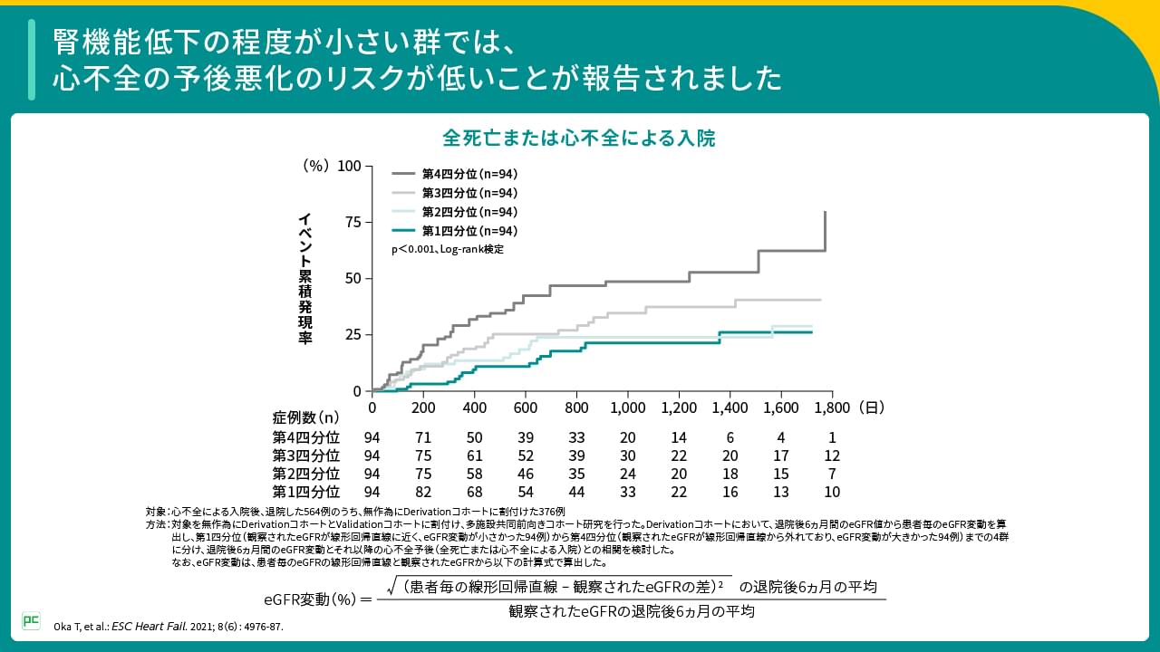 - 心臓と腎臓の病態は強く連関し、腎機能低下が心不全患者の予後に悪影響を及ぼす危険因子であることは過去の疫学研究から明らかとされている1-5)