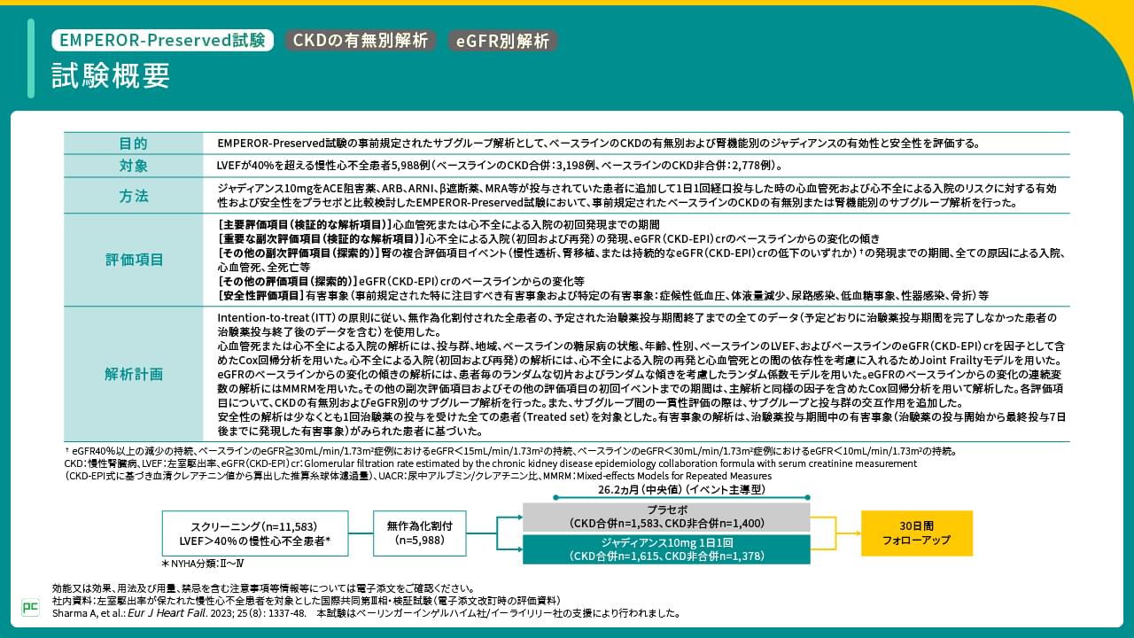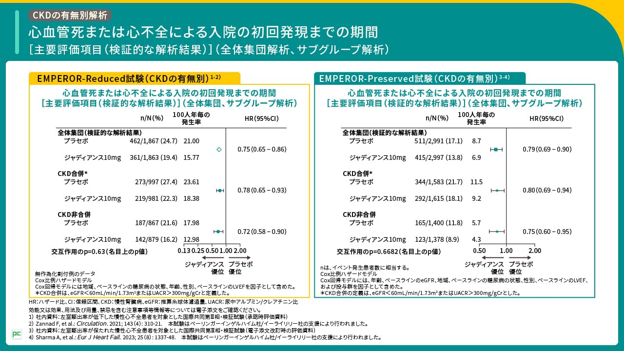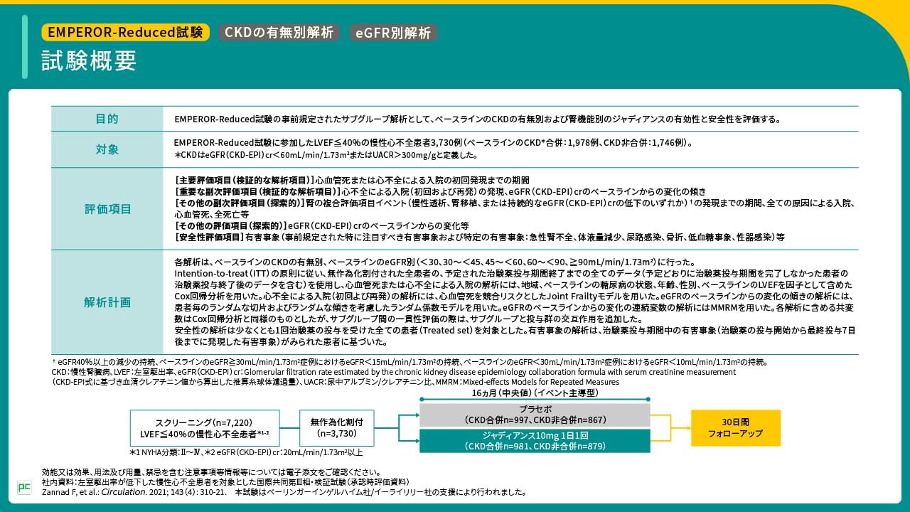 - 心不全患者では腎機能を含めた管理が必要と考えられることから、ジャディアンスの慢性腎臓病(CKD)に対する有効性を示したEMPA-KIDNEY試験6)は心不全治療薬としても重要なエビデンスであると考えられる