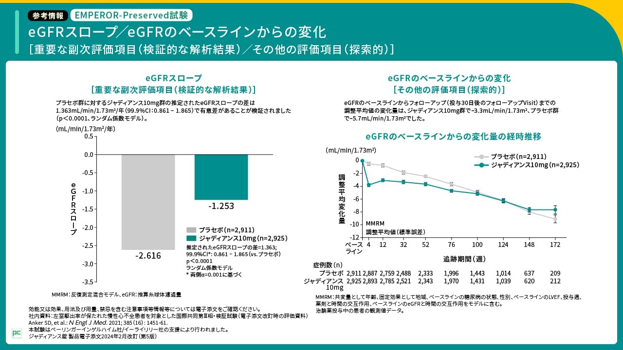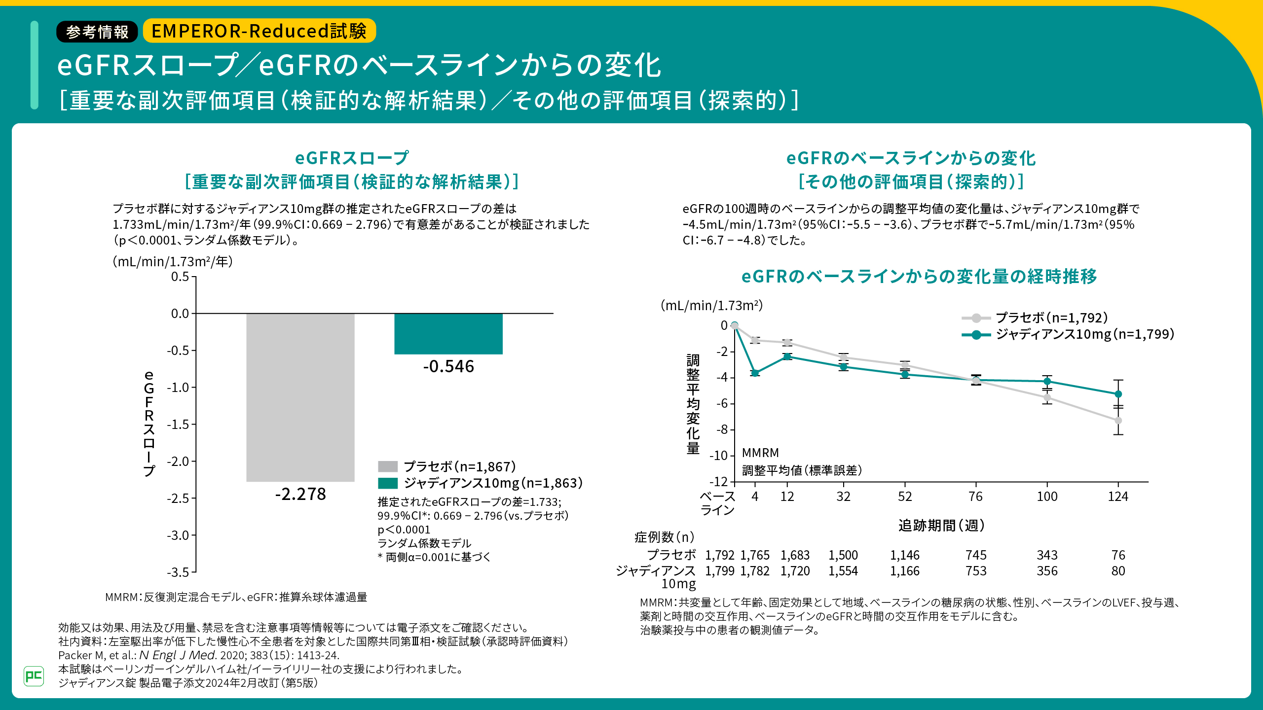 - ジャディアンスは慢性心不全患者を対象としたEMPEROR-Reduced試験7)およびEMPEROR-Preserved試験8)において、心不全患者における腎機能への影響が検討されている