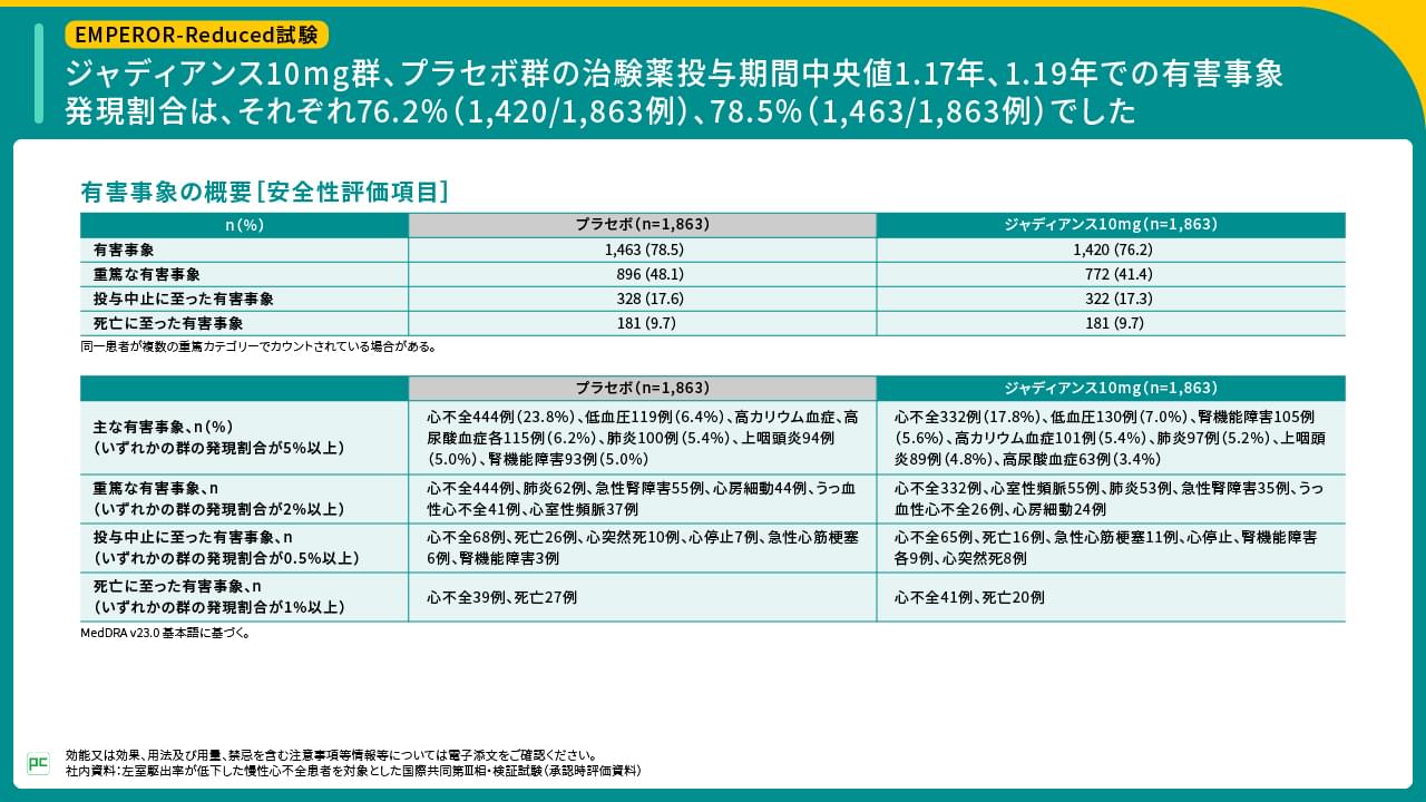 EMPEROR-Reduced試験における有害事象発現割合は、ジャディアンス群、プラセボ群の治験薬投与期間中央値1.17年、1.19年において、それぞれ76.2%、78.5%でした。ジャディアンス群で発現割合が5%以上の有害事象は、心不全17.8%、低血圧7.0%などでした。