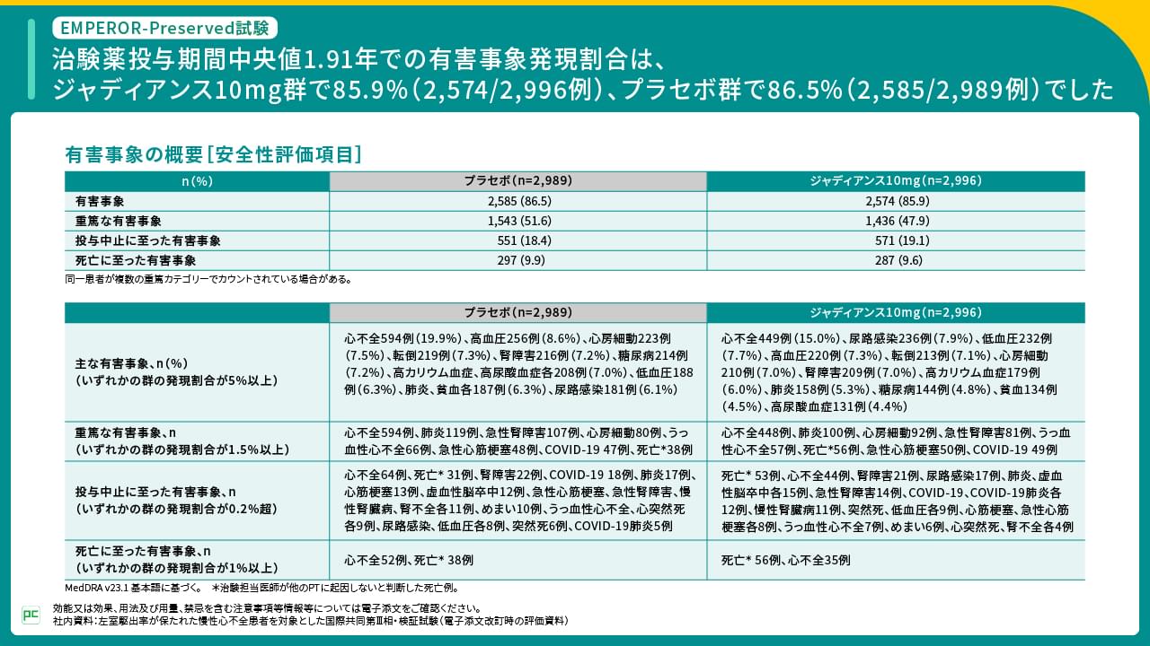 EMPEROR-Preserved試験における有害事象発現割合は、治験薬投与期間中央値1.91年において、ジャディアンス群で85.9%、プラセボ群で86.5%でした。ジャディアンス群で発現割合が5%以上の有害事象は、心不全15.0%、尿路感染7.9%などでした。