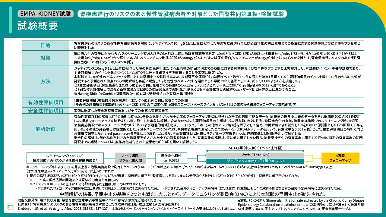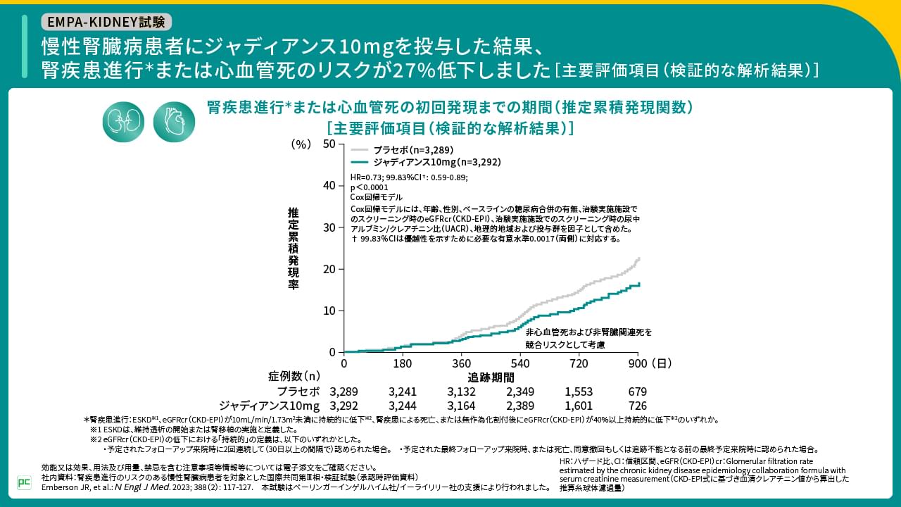 続いて、ジャディアンスの慢性腎臓病の効能又は効果の追加承認※3の根拠となったEMPA-KIDNEY試験の結果も確認していきたいと思います。