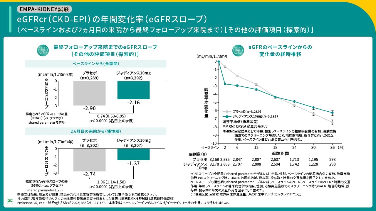 主要評価項目は腎疾患進行※4または心血管死の初回発現までの期間であり、その他の評価項目としてeGFRcr(CKD-EPI)の年間変化率(eGFRスロープ)が評価されました。