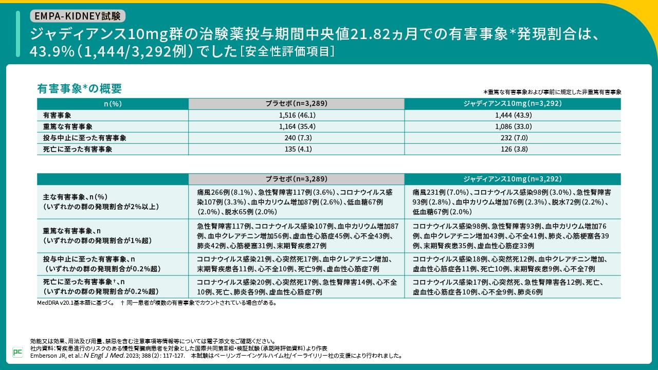 本試験における治験薬投与期間中央値21.82ヵ月での有害事象発現割合は、ジャディアンス群43.9%、プラセボ群46.1%でした。ジャディアンス群で発現割合が2%以上の有害事象は、痛風7.0%、コロナウイルス感染3.0%、急性腎障害2.8%などでした。