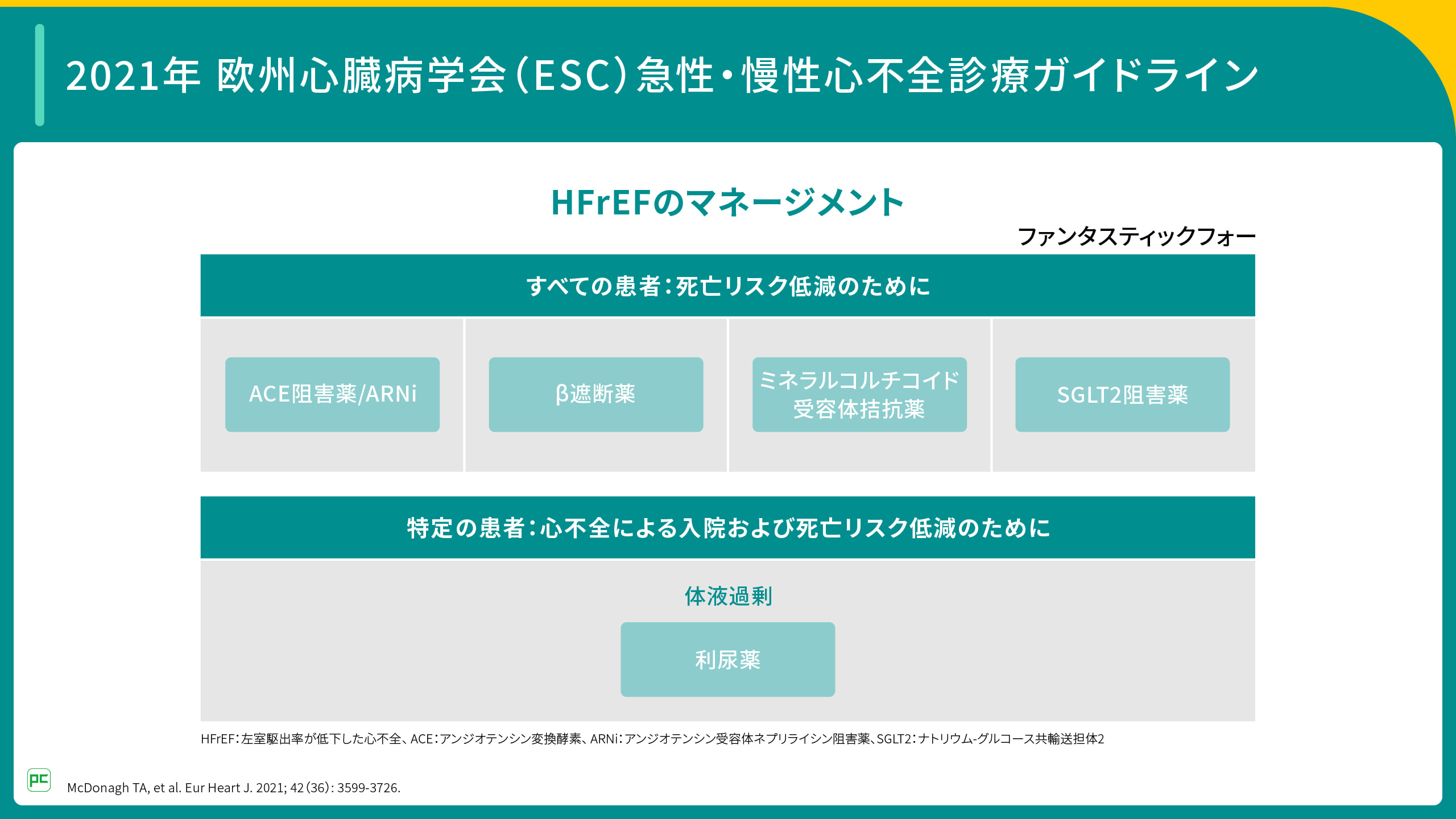 一方、海外における慢性心不全治療の動向として、まず、2021年にESCガイドラインのHFrEFの治療戦略において、死亡率低減のための主な治療としてファンタスティックフォーと呼ばれるACE阻害薬/ARNi、β遮断薬、ミネラルコルチコイド受容体拮抗薬、SGLT2阻害薬の4剤が掲げられ(図3)、SGLT2阻害薬がHFrEF治療の一角を担う薬剤に位置づけられました。